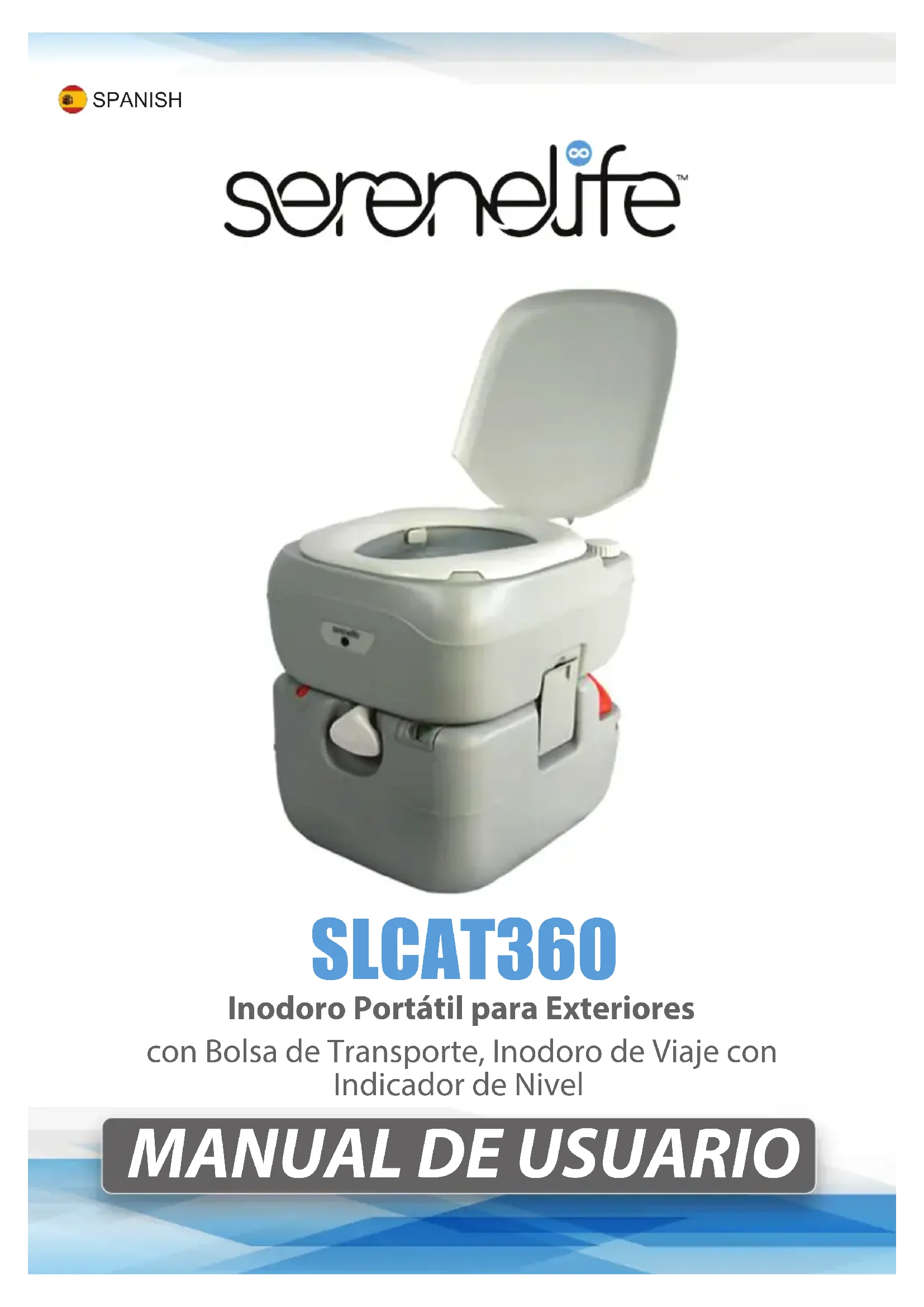 Note: A small amount of water may remain in the top tank but will be harmless during storage.https://serenelifehome.com/pages/contact-us Questions? Comments? We are here to help!MANUAL DE USUARIO SPANISH Inodoro Portátil para Exteriores con Bolsa de Transporte, Inodoro de Viaje con Indicador de Nivel SLCAT3602 www.serenelifehome.com Introducción El inodoro portátil ofrece un manejo sencillo y una práctica eliminación de residuos. Antes de utilizar su inodoro portátil, le recomendamos que lea este manual en su totalidad. Familiarícese con su inodoro portátil y las piezas que lo componen. Al igual que con cualquier producto de calidad, el uso y funcionamiento adecuados evitarán el mantenimiento innecesario. Características: