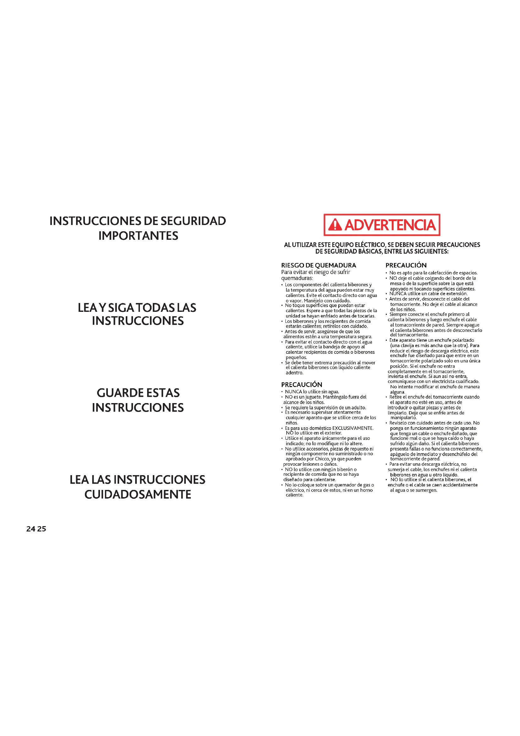 - NUNCA lo utilice sin agua. • NO es un juguete. Manténgalo fuera del alcance de los niños.• Se requiere la supervisión de un adulto.• Es necesario supervisar atentamente cualquier aparato que se utilice cerca de los niños.• Es para uso doméstico EXCLUSIVAMENTE. NO lo utilice en el exterior.• Utilice el aparato únicamente para el uso indicado; no lo modifique ni lo altere. • No utilice accesorios, piezas de repuesto ni ningún componente no suministrado o no aprobado por Chicco, ya que pueden provocar lesiones o daños.• NO lo utilice con ningún biberón o recipiente de comida que no se haya diseñado para calentarse.• No lo coloque sobre un quemador de gas o eléctrico, ni cerca de estos, ni en un horno caliente. PRECAUCIÓN