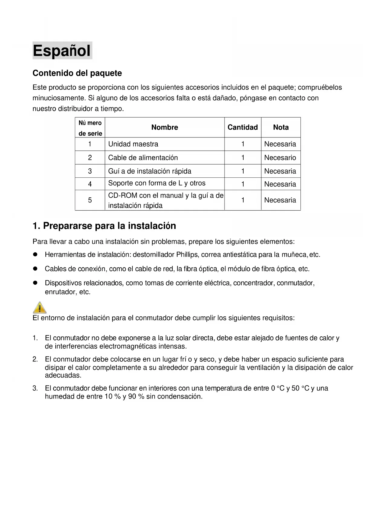 Para llevar a cabo una instalación sin problemas, prepare los siguientes elementos: Herramientas de instalación: destornillador Phillips, correa antiestática para la muñeca, etc. Cables de conexión, como el cable de red, la fibra óptica, el módulo de fibra óptica, etc. Dispositivos relacionados, como tomas de corriente eléctrica, concentrador, conmutador, enrutador, etc. El entorno de instalación para el conmutador debe cumplir los siguientes requisitos: