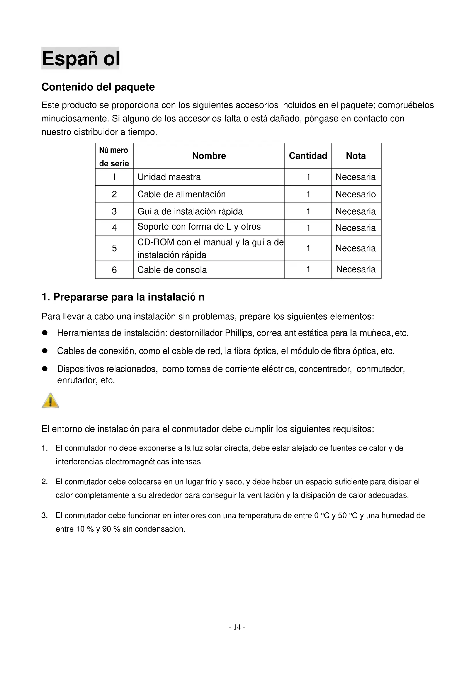 Para llevar a cabo una instalación sin problemas, prepare los siguientes elementos: Herramientas de instalación: destornillador Phillips, correa antiestática para la muñeca, etc. Cables de conexión, como el cable de red, la fibra óptica, el módulo de fibra óptica, etc. Dispositivos relacionados, como tomas de corriente eléctrica, concentrador, conmutador, enrutador, etc. El entorno de instalación para el conmutador debe cumplir los siguientes requisitos: