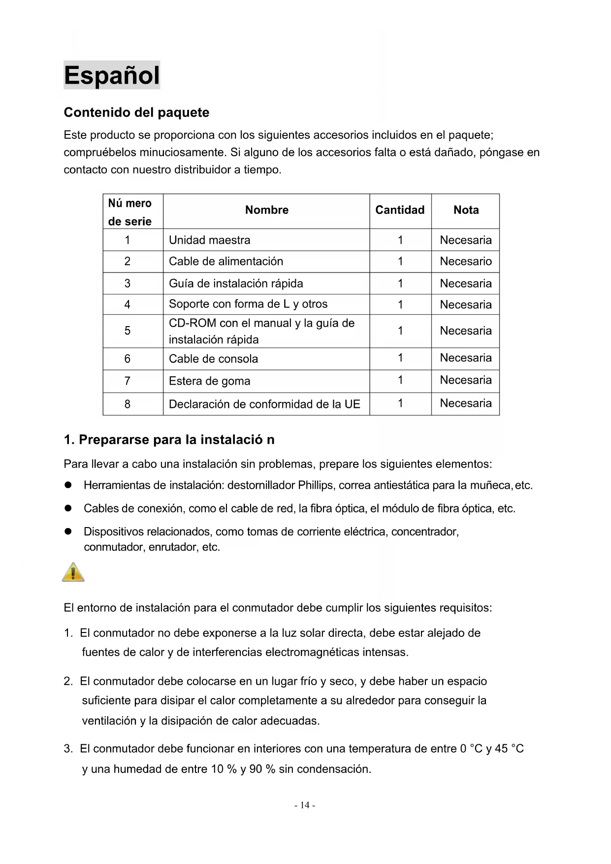 Para llevar a cabo una instalación sin problemas, prepare los siguientes elementos: l Herramientas de instalación: destornillador Phillips, correa antiestática para la muñeca, etc. l Cables de conexión, como el cable de red, la fibra óptica, el módulo de fibra óptica, etc. l Dispositivos relacionados, como tomas de corriente eléctrica, concentrador, conmutador, enrutador, etc. El entorno de instalación para el conmutador debe cumplir los siguientes requisitos: