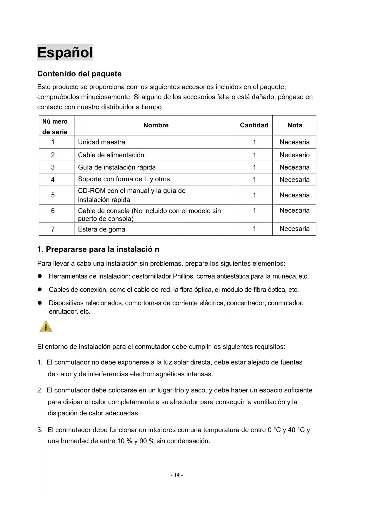 Para llevar a cabo una instalación sin problemas, prepare los siguientes elementos: l Herramientas de instalación: destornillador Phillips, correa antiestática para la muñeca, etc. l Cables de conexión, como el cable de red, la fibra óptica, el módulo de fibra óptica, etc. l Dispositivos relacionados, como tomas de corriente eléctrica, concentrador, conmutador, enrutador, etc. El entorno de instalación para el conmutador debe cumplir los siguientes requisitos:
