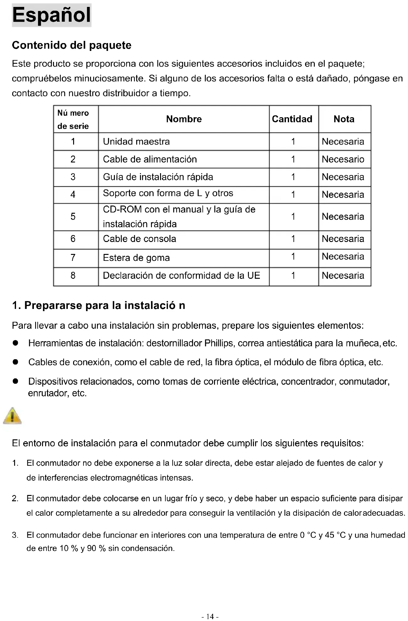 Para llevar a cabo una instalación sin problemas, prepare los siguientes elementos: l Herramientas de instalación: destornillador Phillips, correa antiestática para la muñeca, etc. l Cables de conexión, como el cable de red, la fibra óptica, el módulo de fibra óptica, etc. l Dispositivos relacionados, como tomas de corriente eléctrica, concentrador, conmutador, enrutador, etc. El entorno de instalación para el conmutador debe cumplir los siguientes requisitos: