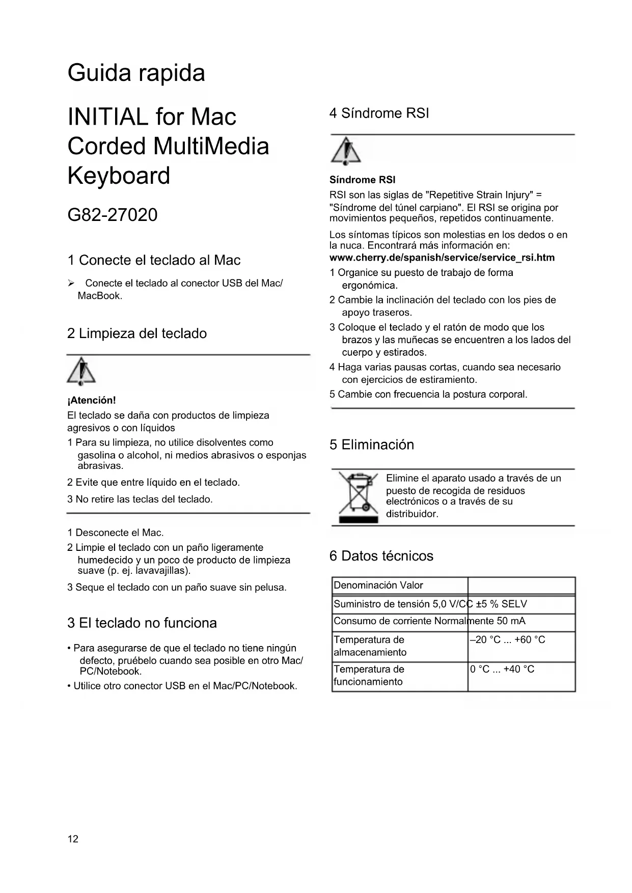 - Utilice otro conector USB en el Mac/PC/Notebook. 4 Síndrome RSI Síndrome RSI RSI son las siglas de "Repetitive Strain Injury" = "Síndrome del túnel carpiano". El RSI se origina por movimientos pequeños, repetidos continuamente. Los síntomas típicos son molestias en los dedos o en la nuca. Encontrará más información en: www.cherry.de/spanish/service/service_rsi.htm 1 Organice su puesto de trabajo de forma ergonómica. 2 Cambie la inclinación del teclado con los pies de apoyo traseros. 3 Coloque el teclado y el ratón de modo que los brazos y las muñecas se encuentren a los lados del cuerpo y estirados. 4 Haga varias pausas cortas, cuando sea necesario con ejercicios de estiramiento. 5 Cambie con frecuencia la postura corporal. 5 Eliminación 6 Datos técnicos Elimine el aparato usado a través de un puesto de recogida de residuos electrónicos o a través de su distribuidor. Denominación Valor Suministro de tensión 5,0 V/CC ±5 % SELV Consumo de corriente Normalmente 50 mA Temperatura de almacenamiento –20 °C ... +60 °C Temperatura de funcionamiento 0 °C ... +40 °C Guida rapida13 7 Contacto ZF Electronics GmbH Cherrystraße 91275 Auerbach Alemania www.cherrycorp.com www.cherry.de Correo electrónico: info@cherry.de Teléfono: Departamento de ventas: +49 (0) 1805 243779* (1805 CHERRY*) Soporte técnico: Tel.: +49 (0) 1805 919108 (*14 cént./min desde la red fija en Alemania. Los pre- cios de las llamadas pueden variar al utilizar una red de telefonía móvil.) Tenga preparada la siguiente información al consul- tar al soporte técnico: