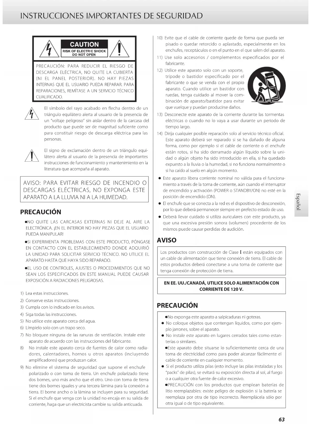 PRECAUCIÓN: PARA REDUCIR EL RIESGO DE DESCARGA ELÉCTRICA, NO QUITE LA CUBIERTA (NI EL PANEL POSTERIOR). NO HAY PIEZAS INTERNAS QUE EL USUARIO PUEDA REPARAR. PARA REPARACIONES, REMÍTASE A UN SERVICIO TÉCNICO CUALIFICADO. El símbolo del rayo acabado en flecha dentro de un triángulo equilátero alerta al usuario de la presencia de un “voltaje peligroso” sin aislar dentro de la carcasa del producto que puede ser de magnitud suficiente como para constituir riesgo de descarga eléctrica para las personas. El signo de exclamación dentro de un triángulo equi-látero alerta al usuario de la presencia de importantes instrucciones de funcionamiento y mantenimiento en la literatura que acompaña al aparato. AVISO: PARA EVITAR RIESGO DE INCENDIO O