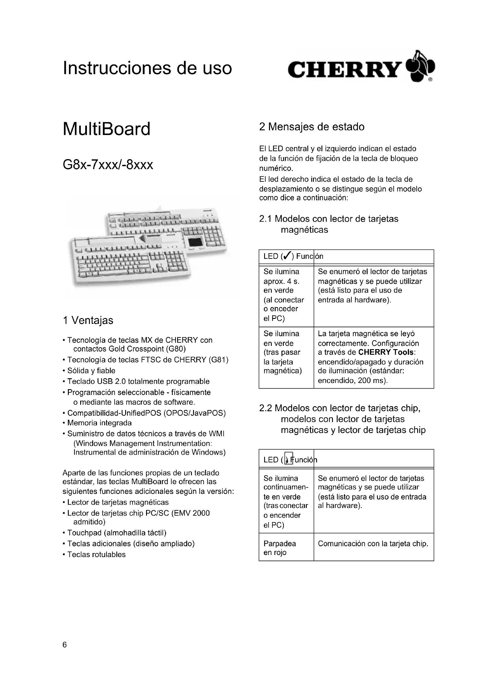 - Sistema operativo y, en su caso, versión insta- lada de un paquete de servicios 14 Instrucciones generales para el usuario En CHERRY, una marca de ZF Friedrichshafen AG, optimizamos continuamente nuestros productos adaptándolos al desarrollo de nuevas tecnologías. Por eso nos reservamos el derecho a realizar modi- ficaciones técnicas. Tanto la determinación de la fiabilidad como la definición de las características técnicas se realizan siguiendo métodos de compro- bación internos para cumplir con las prescripciones o normas reconocidas a nivel internacional. Los requisitos divergentes pueden cumplirse con la cooperación mutua. El uso y el almacenamiento no adecuados, así como las influencias externas pue- den dar lugar a averías y daños. No asumimos ningún tipo de garantía por defectos basados en una modificación del producto por parte del usuario, y no nos hacemos responsables en caso de modificaciones no autorizadas. Todas las reparaciones deben encomendarse a nosotros o a una persona o establecimiento que disponga de la correspondiente autorización oficial. Las reclamaciones eventuales de indemnizaciones por daños y perjuicios contra ZF Friedrichshafen AG o sus representantes designados – indistintamente del fundamento jurídico (incluidos daños corporales debidos al estrés) – quedan excluidas, a menos que se trate de dolo, negligencia grave o no observan- cia de determinaciones ineludibles de la garantía del producto, o en caso de infracciones contra la vida, el cuerpo o la salud. Las instrucciones anterio- res sólo son válidas para el producto suministrado. Para obtener más información, diríjase al distribuidor correspondiente o póngase en contacto con nosotros directamente.11 MultiBoard G8x-7xxx/-8xxx 1 Avantages