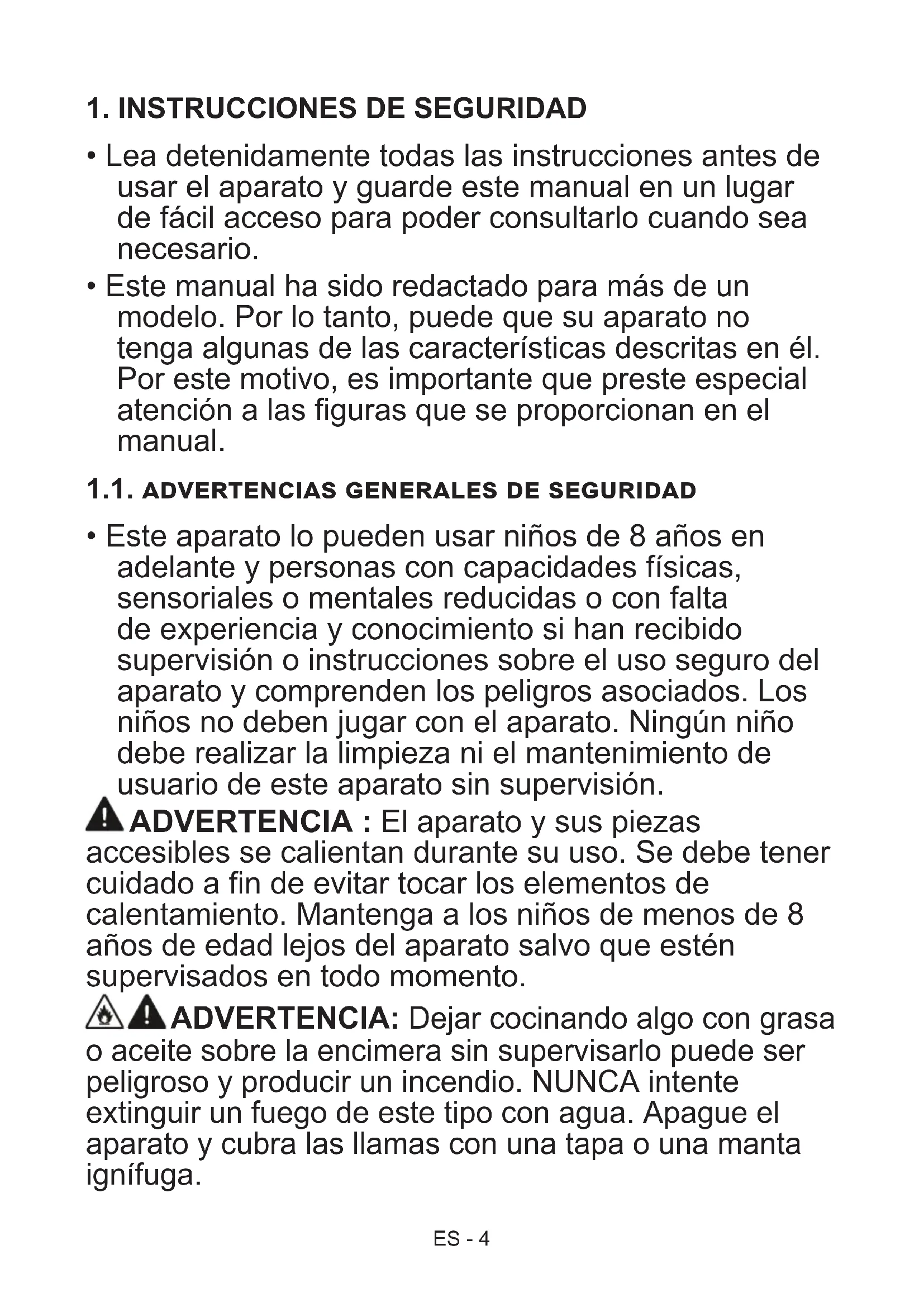 - Este aparato lo pueden usar niños de 8 años en adelante y personas con capacidades físicas, sensoriales o mentales reducidas o con falta de experiencia y conocimiento si han recibido supervisión o instrucciones sobre el uso seguro del aparato y comprenden los peligros asociados. Los niños no deben jugar con el aparato. Ningún niño debe realizar la limpieza ni el mantenimiento de usuario de este aparato sin supervisión. ADVERTENCIA : El aparato y sus piezas accesibles se calientan durante su uso. Se debe tener cuidado a fin de evitar tocar los elementos de calentamiento. Mantenga a los niños de menos de 8 años de edad lejos del aparato salvo que estén supervisados en todo momento. ADVERTENCIA: Dejar cocinando algo con grasa o aceite sobre la encimera sin supervisarlo puede ser peligroso y producir un incendio. NUNCA intente extinguir un fuego de este tipo con agua. Apague el aparato y cubra las llamas con una tapa o una manta ignífuga.ES - 5 PRECAUCIÓN: El proceso de cocción debe ser supervisado. Un proceso de cocción a corto plazo debe ser supervisado continuamente. ADVERTENCIA: Peligro de incendio: No coloque objetos sobre las superficies donde se cocina. ADVERTENCIA: Si la superficie está rajada, apague el aparato para evitar la posibilidad de que se produzca una descarga eléctrica.