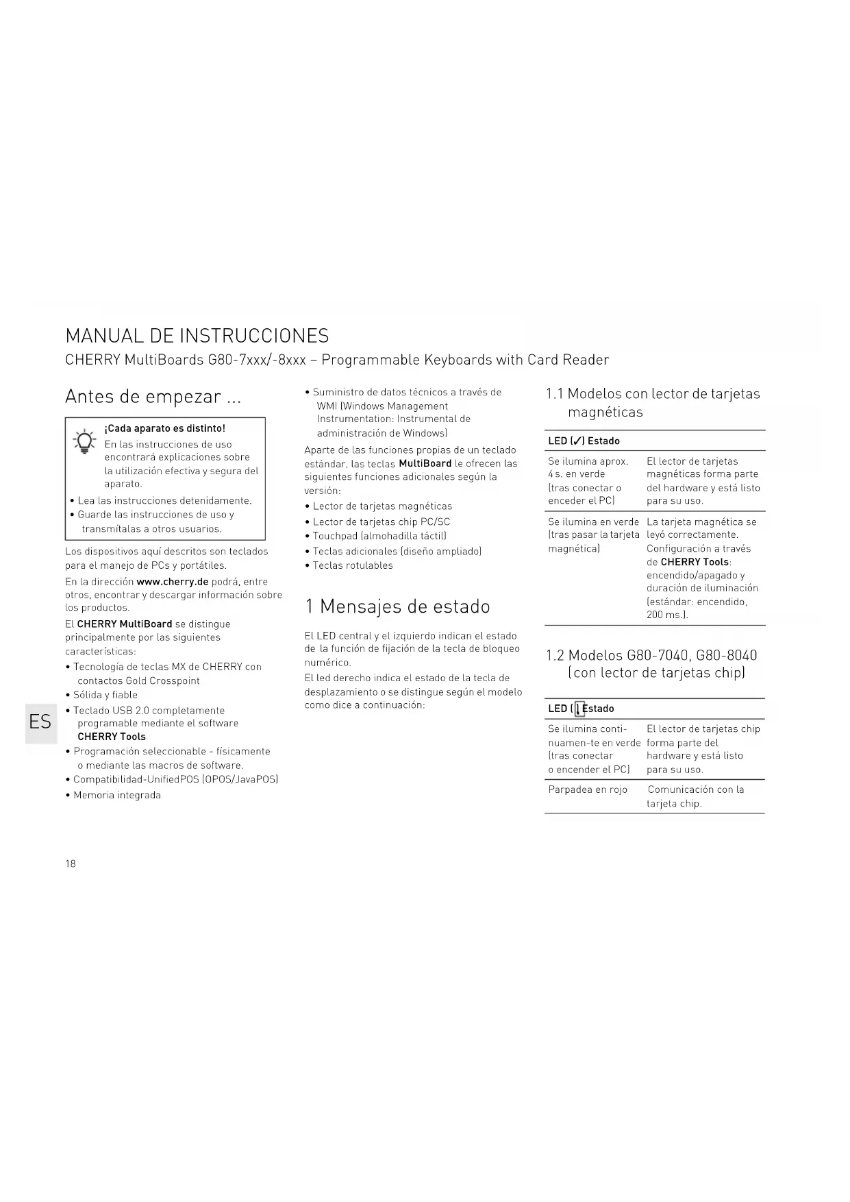 - Système d'exploitation et le cas échéant version installée d'un Service Pack Cherry Europe GmbH Cherrystraße 2 91275 Auerbach/OPf. Allemagne Internet : www.cherry.de FR18 Antes de empezar ... Los dispositivos aquí descritos son teclados para el manejo de PCs y portátiles. En la dirección www.cherry.de podrá, entre otros, encontrar y descargar información sobre los productos. El CHERRY MultiBoard se distingue principalmente por las siguientes características: