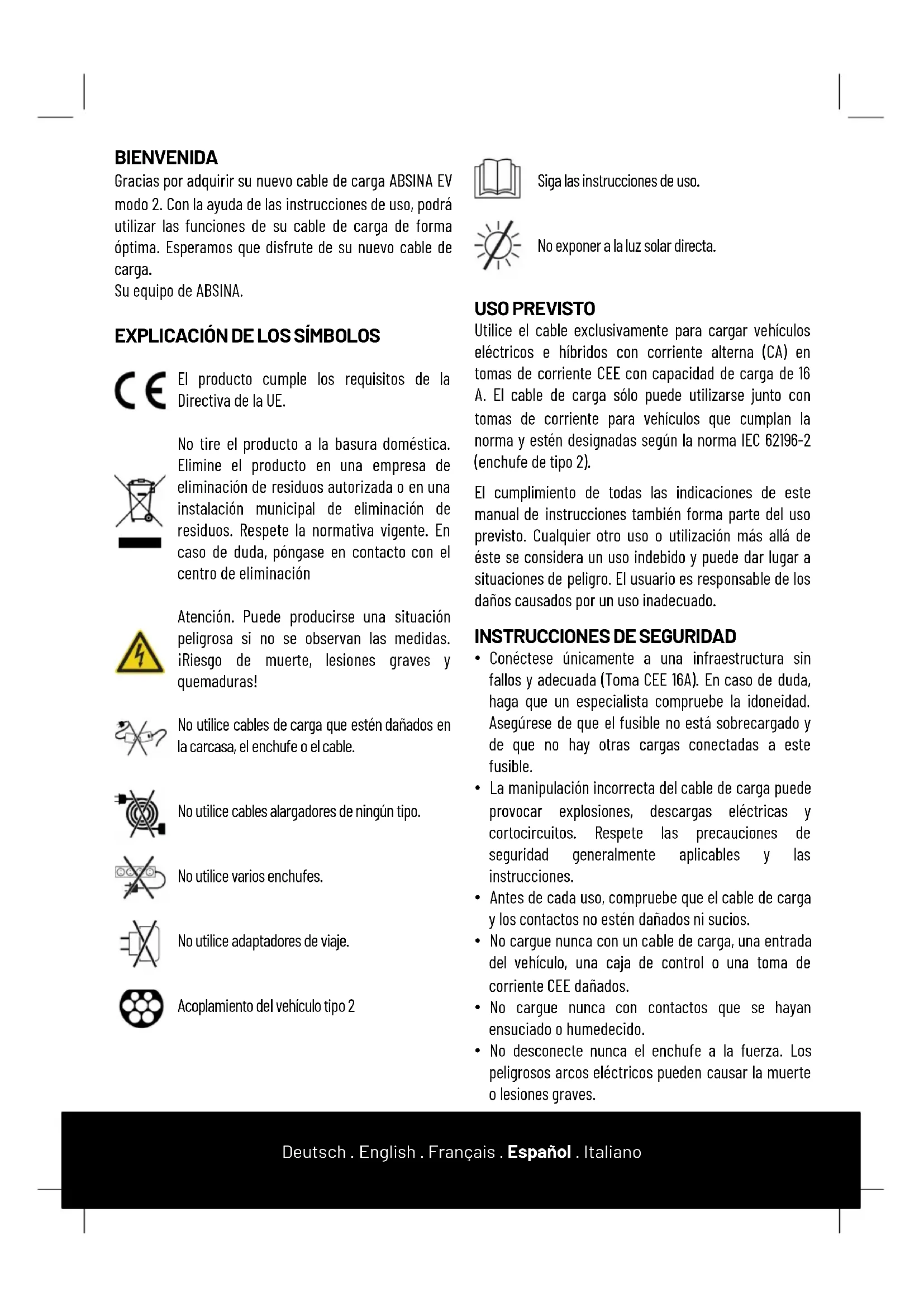 - No desconecte nunca el enchufe a la fuerza. Los peligrosos arcos eléctricos pueden causar la muerte o lesiones graves. BIENVENIDA Gracias por adquirir su nuevo cable de carga ABSINA EV modo 2. Con la ayuda de las instrucciones de uso, podrá utilizar las funciones de su cable de carga de forma óptima. Esperamos que disfrute de su nuevo cable de carga. Su equipo de ABSINA.