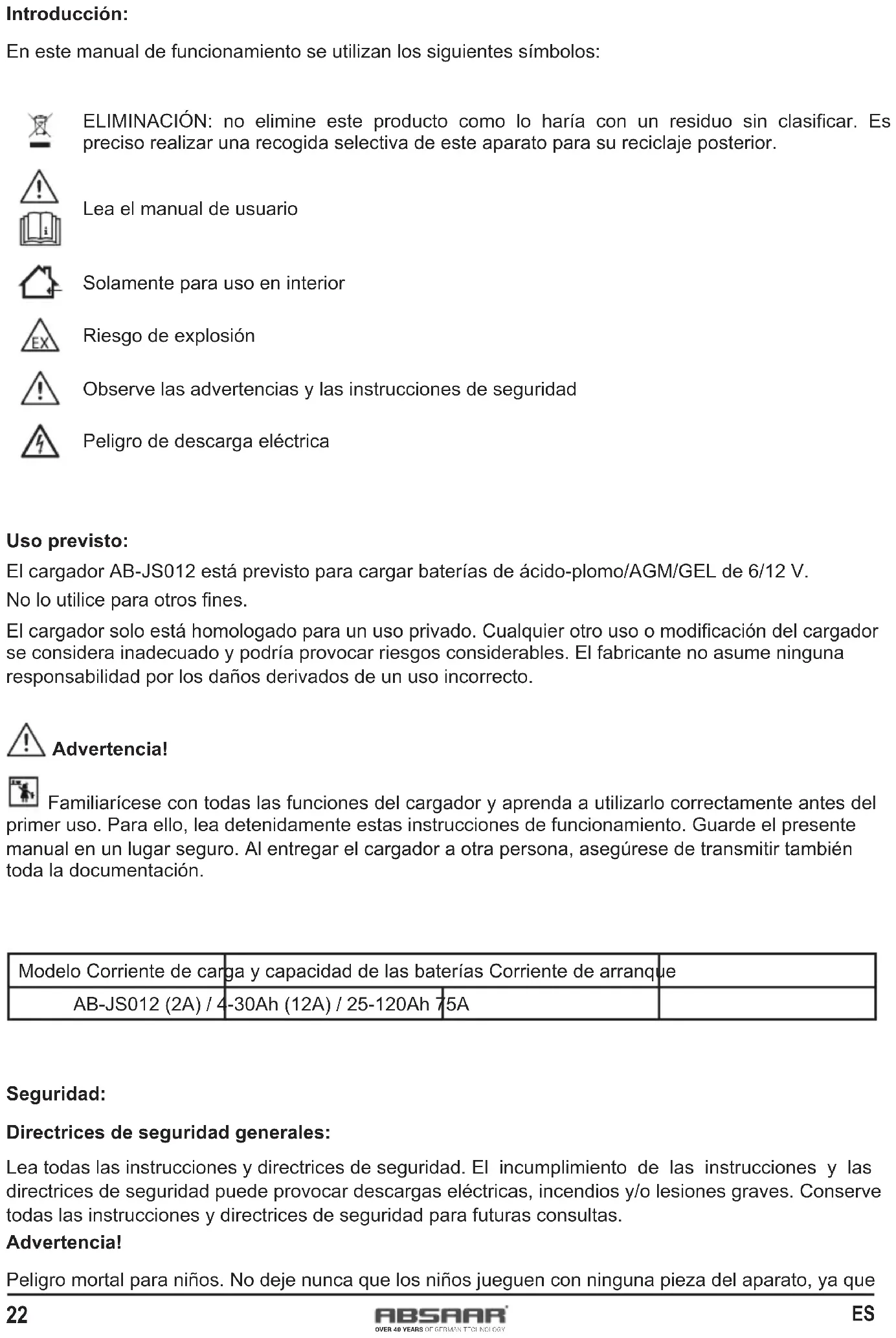 Introducción: En este manual de funcionamiento se utilizan los siguientes símbolos: ELIMINACIÓN: no elimine este producto como lo haría con un residuo sin clasicar. Es preciso realizar una recogida selectiva de este aparato para su reciclaje posterior. Lea el manual de usuario Solamente para uso en interior Riesgo de explosión Observe las advertencias y las instrucciones de seguridad Peligro de descarga eléctrica Uso previsto: El cargador AB-JS012 está previsto para cargar baterías de ácido-plomo/AGM/GEL de 6/12 V. No lo utilice para otros nes. El cargador solo está homologado para un uso privado. Cualquier otro uso o modicación del cargador se considera inadecuado y podría provocar riesgos considerables. El fabricante no asume ninguna responsabilidad por los daños derivados de un uso incorrecto. Advertencia! Familiarícese con todas las funciones del cargador y aprenda a utilizarlo correctamente antes del primer uso. Para ello, lea detenidamente estas instrucciones de funcionamiento. Guarde el presente manual en un lugar seguro. Al entregar el cargador a otra persona, asegúrese de transmitir también toda la documentación. Modelo Corriente de carga y capacidad de las baterías Corriente de arranque AB-JS012 (2A) / 4-30Ah (12A) / 25-120Ah 75A Seguridad: Directrices de seguridad generales: Lea todas las instrucciones y directrices de seguridad. El incumplimiento de las instrucciones y las directrices de seguridad puede provocar descargas eléctricas, incendios y/o lesiones graves. Conserve todas las instrucciones y directrices de seguridad para futuras consultas. Advertencia! Peligro mortal para niños. No deje nunca que los niños jueguen con ninguna pieza del aparato, ya que23