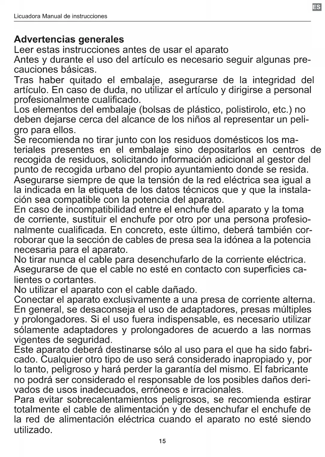 Advertencias generales Leer estas instrucciones antes de usar el aparato Antes y durante el uso del artículo es necesario seguir algunas pre- cauciones básicas. Tras haber quitado el embalaje, asegurarse de la integridad del artículo. En caso de duda, no utilizar el artículo y dirigirse a personal profesionalmente cualicado. Los elementos del embalaje (bolsas de plástico, polistirolo, etc.) no deben dejarse cerca del alcance de los niños al representar un peli- gro para ellos. Se recomienda no tirar junto con los residuos domésticos los ma- teriales presentes en el embalaje sino depositarlos en centros de recogida de residuos, solicitando información adicional al gestor del punto de recogida urbano del propio ayuntamiento donde se resida. Asegurarse siempre de que la tensión de la red eléctrica sea igual a la indicada en la etiqueta de los datos técnicos que y que la instala- ción sea compatible con la potencia del aparato. En caso de incompatibilidad entre el enchufe del aparato y la toma de corriente, sustituir el enchufe por otro por una persona profesio- nalmente cualicada. En concreto, este último, deberá también cor- roborar que la sección de cables de presa sea la idónea a la potencia necesaria para el aparato. No tirar nunca el cable para desenchufarlo de la corriente eléctrica. Asegurarse de que el cable no esté en contacto con supercies ca- lientes o cortantes. No utilizar el aparato con el cable dañado. Conectar el aparato exclusivamente a una presa de corriente alterna. En general, se desaconseja el uso de adaptadores, presas múltiples y prolongadores. Si el uso fuera indispensable, es necesario utilizar sólamente adaptadores y prolongadores de acuerdo a las normas vigentes de seguridad. Este aparato deberá destinarse sólo al uso para el que ha sido fabri- cado. Cualquier otro tipo de uso será considerado inapropiado y, por lo tanto, peligroso y hará perder la garantía del mismo. El fabricante no podrá ser considerado el responsable de los posibles daños deri- vados de usos inadecuados, erróneos e irracionales. Para evitar sobrecalentamientos peligrosos, se recomienda estirar totalmente el cable de alimentación y de desenchufar el enchufe de la red de alimentación eléctrica cuando el aparato no esté siendo utilizado.Licuadora Manual de instrucciones