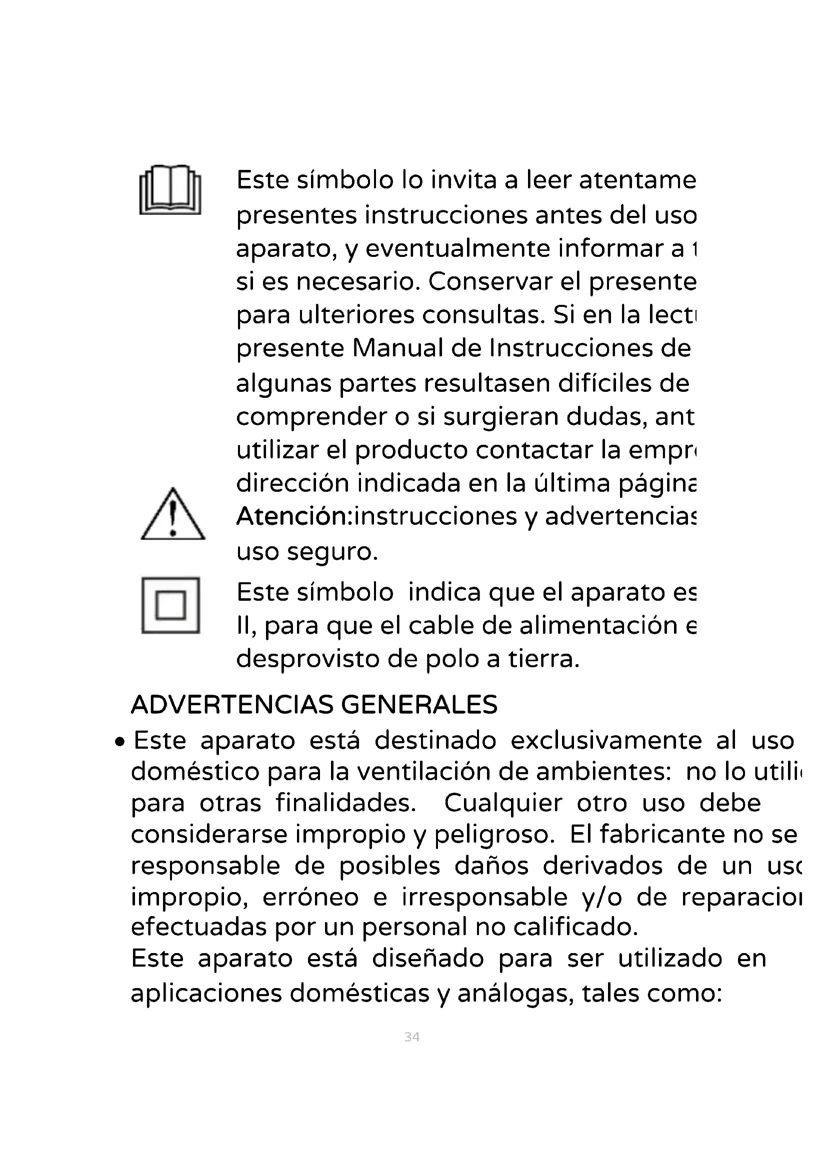 Este símbolo lo invita a leer atentamente las presentes instrucciones antes del uso del aparato, y eventualmente informar a terceros, si es necesario. Conservar el presente manual para ulteriores consultas. Si en la lectura del presente Manual de Instrucciones de Uso algunas partes resultasen difíciles de comprender o si surgieran dudas, antes de utilizar el producto contactar la empresa a la dirección indicada en la última página. Atención:instrucciones y advertencias para el uso seguro.