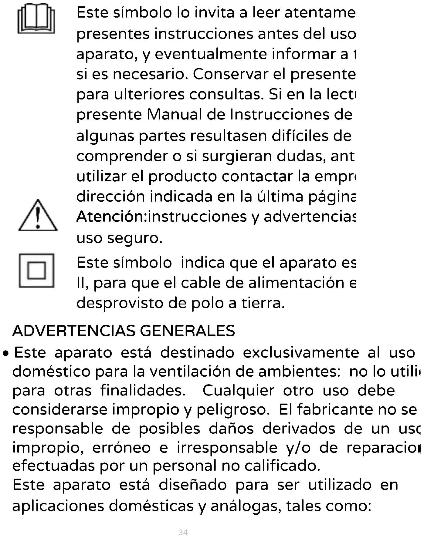Este símbolo indica que el aparato es de clase II, para que el cable de alimentación está desprovisto de polo a tierra. ADVERTENCIAS GENERALES Este aparato está destinado exclusivamente al uso doméstico para la ventilación de ambientes: no lo utilice para otras finalidades. Cualquier otro uso debe considerarse impropio y peligroso. El fabricante no se hace responsable de posibles daños derivados de un uso impropio, erróneo e irresponsable y/o de reparaciones efectuadas por un personal no calificado. Este aparato está diseñado para ser utilizado en aplicaciones domésticas y análogas, tales como:35 - Personal de cocina en tiendas, oficinas y otros entornos de trabajo; - Casas rurales - Por los clientes en hoteles, moteles y otros entornos de tipo residencial - Cama y desayuno tipo ambientes No introducir ningún utensilio ni los dedos entre las mallas de la red de protección del ventilador. No utilizar el aparato con una temperatura ambiente superior a los 40°C. Este aparato puede ser utilizado por niños de por lo menos 8 años de edad y personas con capacidades físicas, sensoriales o mentales reducidas o falta de experiencia y conocimientos, a condición de que estén bajo supervisión o hayan recibido instrucción es sobre el uso seguro del aparato y estén enterados de los riesgos existentes. Los niños no deben jugar con el aparato. Los niños no deben realizar la limpieza y el mantenimiento de usuario sin supervisión. Este aparato puede ser utilizado por niños mayores de 8 años y por personascon reducidas capacidades físicas, sensoriales o mentales o desprovistas de experiencia y conocimientos siempre que cuenten con una vigilancia adecuada o que hayan recibido instrucciones sobre cómo utilizar el aparato en condiciones de seguridad comprendiendo los peligros que comporta. Los niños no deben jugar con el36 aparato. Las operaciones de limpieza y de mantenimiento no pueden ser efectuadas por niños de edad inferior a 8 años sin la supervisión de un adulto. Atención: cuando se utilizan aparatos eléctricos, es preciso respetar siempre las precauciones de seguridad básicas para evitar los riesgos de incendio, de descargas eléctricas y de lesiones físicas. No utilizar el aparato si no funciona correctamente o si parece deteriorado; en caso de duda, acudir a personal profesional calificado. No utilizar el aparato si no funciona correctamente o si parece deteriorado; en caso de duda, acudir a personal profesional calificado. Asegurarse de que el ventilador funciona correctamente: de no ser así, apagar el aparato y hacerlo revisar por personal profesional calificado. No desplazar el aparato mientras está funcionando. Si el aparato no está en función, sacar la clavija de la toma de corriente. Es indispensable desenchufar el aparato antes de montar el pie o cualquier otro accesorio o antes de desmontarlo(s). No dejar el aparato expuesto a los agentes atmosféricos (sol, lluvia, etc.). No tocar el aparato con las manos o los pies mojados. No tirar del cable para desplazar el aparato.37 No desplazar el aparato mientras está funcionando. No tirar del cable de alimentación o del propio aparato para sacar la clavija de la toma de corriente. Si el cable de alimentación está estropeado, hacerlo cambiar por el fabricante, por su servicio de asistencia técnica o en todo caso por una persona con una calificación similar a fin de prevenir cualquier riesgo. Este aparato no está destinado a ser controlado por un temporizador externo o por un sistema de mando a distancia separado, esto para evitar el riesgo de incendio si el aparato estuviera cubierta o colocado de forma incorrecta. En caso de avería o de funcionamiento defectuoso, apagar el aparato y hacerlo revisar por personal profesional calificado; una reparación realizada por personal no calificado puede constituir una fuente de peligro y además anula la garantía. Comprobar que el ventilador está desconectado de la red de alimentación antes de retirar la pantalla de protección . INSTALACIÓN Después de retirar el embalaje, asegurarse de la integridad del aparato; en caso de duda, no utilizarlo y acudir a personal profesional calificado. Los elementos de embalaje (bolsas de plástico, poliestireno expandido, clavos, etc.) no se deben dejar al alcance de los niños ya que son fuentes potenciales de peligro, sino que se tienen que eliminar en los contenedores de recogida selectiva específicos. Antes de conectar el aparato, comprobar que los valores de tensión indicados en la placa de datos corresponden a los de la red eléctrica. En38 caso de incompatibilidad entre el enchufe y la clavija del aparato, hacer cambiar el enchufe por otro de un tipo adecuado acudiendo para ello a personal profesional calificado, que comprobará la sección de los cables del enchufe está adaptado a la potencia absorbida por el aparato. En general está desaconsejado el uso de adaptadores o de alargadores; si fuera indispensable, tienen que ser conformes a las normas vigentes de seguridad y su capacidad de amperaje no tiene que ser inferior a la máxima del aparato. Antes de cada uso, comprobar que el aparato está en buen estado y que el cordón eléctrico no está dañado: en caso de duda, acudir a personal profesional calificado. La toma de corriente tiene que ser fácilmente accesible para desenchufar la clavija con facilidad en caso de emergencia. No colocar el aparato encima de una repisa y/o cerca de un lavabo o de un recipiente con líquidos (dejar una distancia mínima de 2 metros) para evitar el riesgo de caída dentro del líquido. Colocar el ventilador alejado de tejidos (cortinas, etc.) o materiales volátiles que puedan obstruir la rejilla de ventilación; comprobar también que la parte delantera esté libre de materiales volátiles (polvo, etc.). Colocar el aparato lejos de toda fuente de calor (por ej. llamas libres, hornillo de gas, etc.). La superficie de apoyo tiene que ser estable, no inclinada (ya que el ap