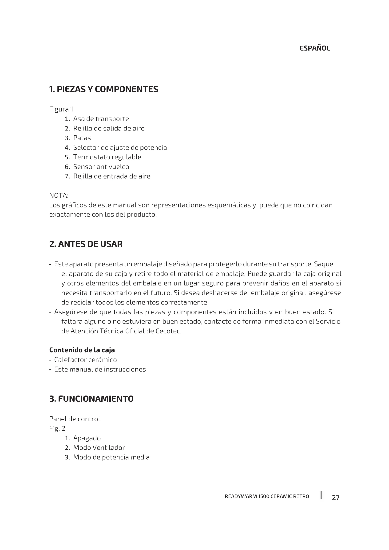 Los derechos de propiedad intelectual sobre los textos de este manual pertenecen a CECOTEC INNOVACIONES, S.L. Quedan reservados todos los derechos. El contenido de esta publicación no podrá, ni en parte ni en su totalidad, reproducirse, almacenarse en un sistema de recuperación, transmitirse o distribuirse por ningún medio (electrónico, mecánico, fotocopia, grabación o similar) sin la previa autorización de CECOTEC INNOVACIONES, S.L.READYWARM 1500 CERAMIC RETRO