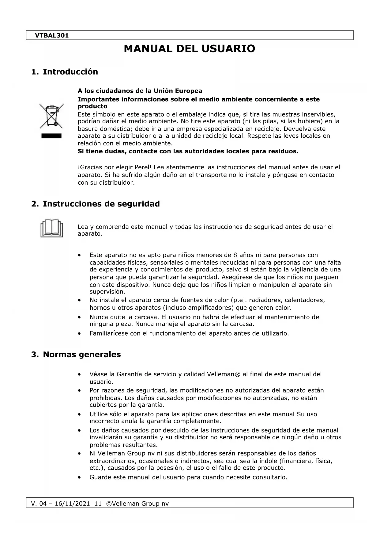 Velleman Group nv dispone de los derechos de autor para este manual del usuario. Todos los derechos mundiales reservados. Está estrictamente prohibido reproducir, traducir, copiar, editar y guardar este manual del usuario o partes de ello sin el consentimiento previo por escrito del propietario del copyright.VTBAL301