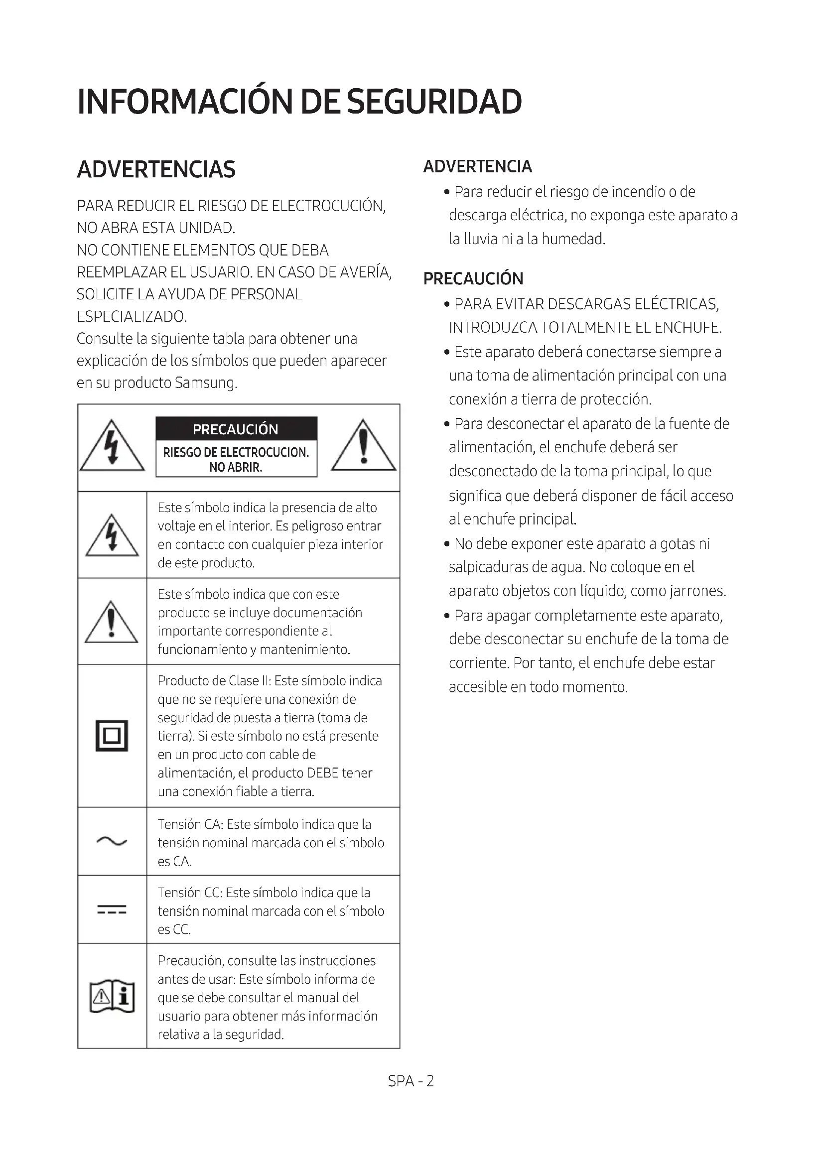 ESPECIALIZADO. Consulte la siguiente tabla para obtener una explicación de los símbolos que pueden aparecer en su producto Samsung. PRECAUCIÓN RIESGO DE ELECTROCUCION. NO ABRIR.Este símbolo indica la presencia de alto voltaje en el interior. Es peligroso entrar en contacto con cualquier pieza interior de este producto.Este símbolo indica que con este producto se incluye documentación importante correspondiente al funcionamiento y mantenimiento.Producto de Clase II: Este símbolo indica que no se requiere una conexión de seguridad de puesta a tierra (toma de tierra). Si este símbolo no está presente en un producto con cable de alimentación, el producto DEBE tener una conexión able a tierra.Tensión CA: Este símbolo indica que la tensión nominal marcada con el símbolo es CA.Tensión CC: Este símbolo indica que la tensión nominal marcada con el símbolo es CC.Precaución, consulte las instrucciones antes de usar: Este símbolo informa de que se debe consultar el manual del usuario para obtener más información relativa a la seguridad. ADVERTENCIA