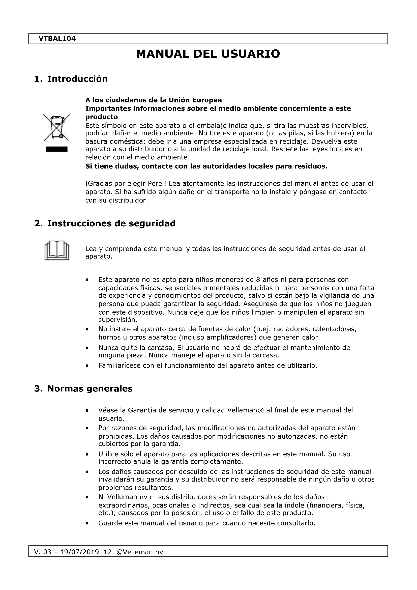 Velleman NV dispone de los derechos de autor para este manual del usuario. Todos los derechos mundiales reservados. Está estrictamente prohibido reproducir, traducir, copiar, editar y guardar este manual del usuario o partes de ello sin el consentimiento previo por escrito del propietario del copyright.VTBAL104