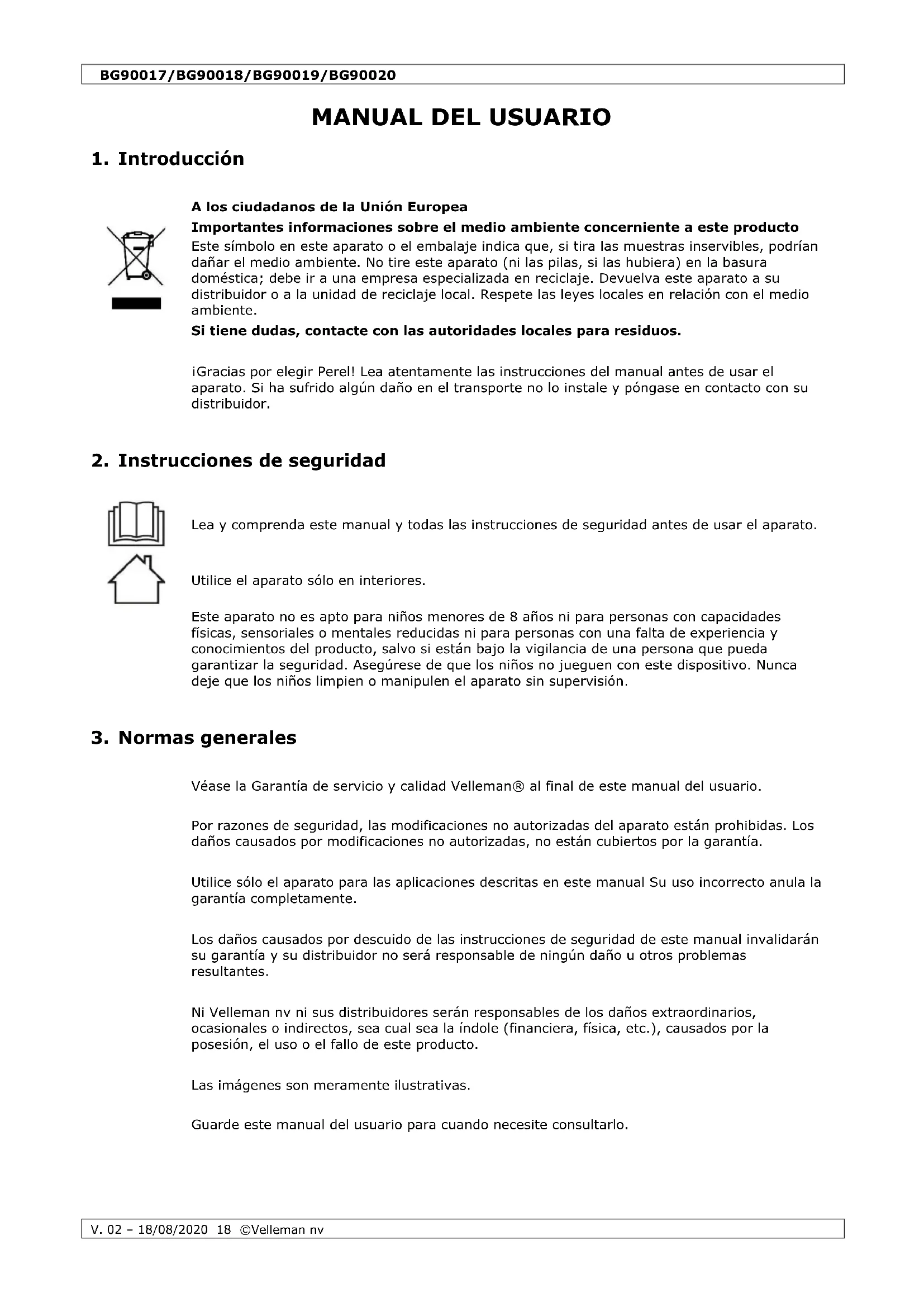 Velleman NV dispone de los derechos de autor para este manual del usuario. Todos los derechos mundiales reservados. Está estrictamente prohibido reproducir, traducir, copiar, editar y guardar este manual del usuario o partes de ello sin el consentimiento previo por escrito del propietario del copyright.BG90017/BG90018/BG90019/BG90020
