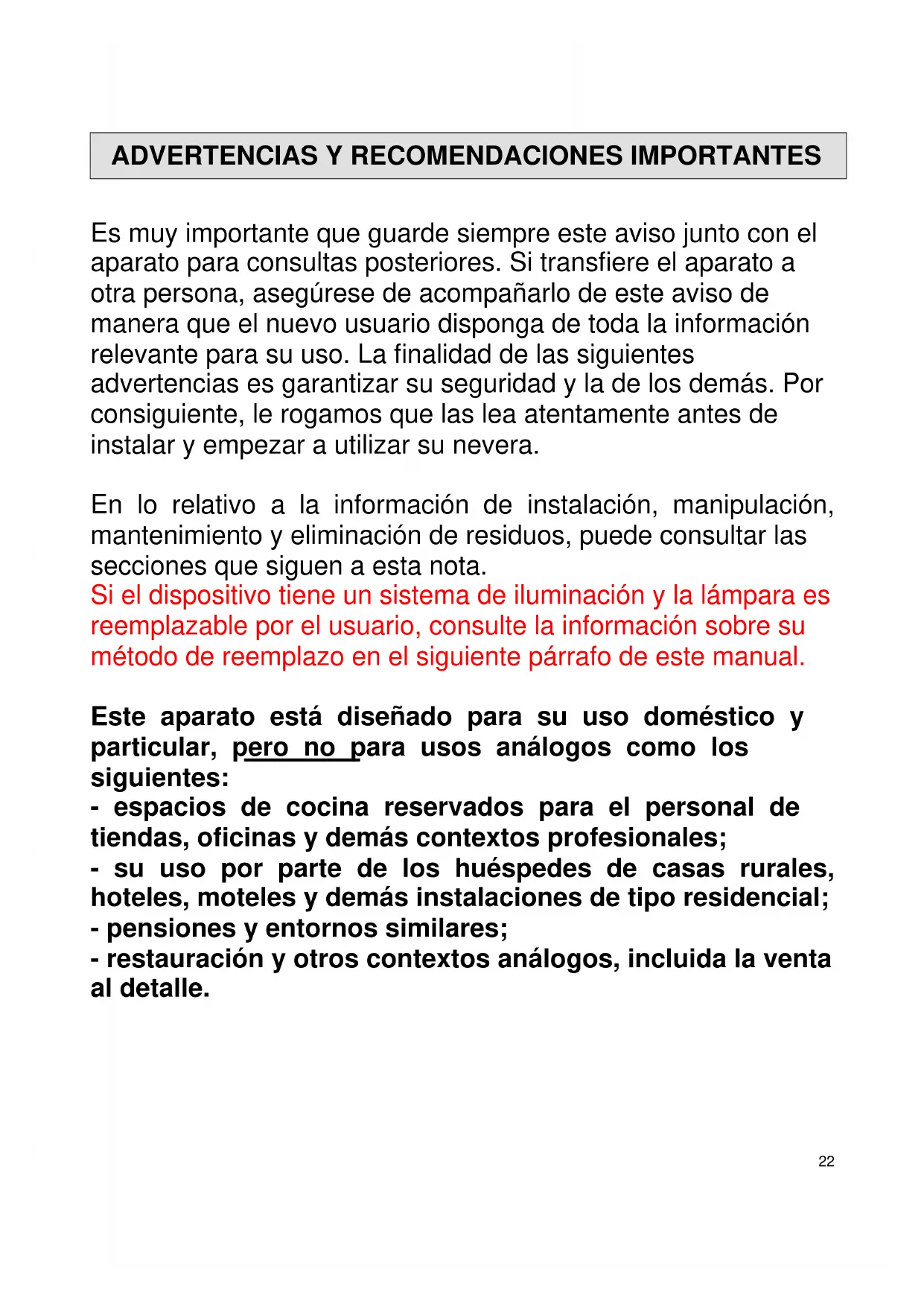 Es muy importante que guarde siempre este aviso junto con el aparato para consultas posteriores. Si transfiere el aparato a otra persona, asegúrese de acompañarlo de este aviso de manera que el nuevo usuario disponga de toda la información relevante para su uso. La finalidad de las siguientes advertencias es garantizar su seguridad y la de los demás. Por consiguiente, le rogamos que las lea atentamente antes de instalar y empezar a utilizar su nevera. En lo relativo a la información de instalación, manipulación, mantenimiento y eliminación de residuos, puede consultar las secciones que siguen a esta nota. Si el dispositivo tiene un sistema de iluminación y la lámpara es reemplazable por el usuario, consulte la información sobre su método de reemplazo en el siguiente párrafo de este manual. Este aparato está diseñado para su uso doméstico y particular, pero no para usos análogos como los siguientes: - espacios de cocina reservados para el personal de tiendas, oficinas y demás contextos profesionales; - su uso por parte de los huéspedes de casas rurales, hoteles, moteles y demás instalaciones de tipo residencial; - pensiones y entornos similares; - restauración y otros contextos análogos, incluida la venta al detalle.23 Seguridad Este aparato puede ser utilizado por niños de 8 o más años, así como por personas con algún tipo de discapacidad física, mental o sensorial o sin experiencia o conocimientos, siempre que cuenten con la supervisión adecuada o se les hayan dado las instrucciones precisas para una utilización segura y todos los riesgos posibles hayan sido tenidos en consideración. Los niños no deben jugar con este electrodoméstico. Es recomendable mantenerlo lejos del alcance de niños menores de 3 años, a menos que estén bajo vigilancia continua. Los niños no deberán realizar las tareas de limpieza y mantenimiento del aparato sin la supervisión de un adulto. Los niños de 3 a 8 años de edad pueden cargar y descargar aparatos de refrigeración. Desconecte el aparato de la toma de corriente antes de proceder a su limpieza, descongelación, sustitución de la lámpara, traslado o limpieza del suelo. ADVERTENCIA: No dañar el circuito de refrigeración. ADVERTENCIA: No utilizar aparatos eléctricos en el interior del compartimento, a menos que sean del tipo recomendado por el fabricante. ADVERTENCIA: No utilizar dispositivos mecánicos o de otro tipo para acelerar el proceso de descongelación, a menos que hayan sido recomendados por el fabricante. ADVERTENCIA: Mantener despejados los orificios de ventilación de la carcasa del aparato y de la estructura de encastre. ADVERTENCIA: No ubique tomas de corriente portátiles o fuentes de alimentación portátiles en la parte posterior del dispositivo. ADVERTENCIA: Al colocar el aparato, asegúrese de que el cable de alimentación no esté atrapado o dañado.24 No conectar el aparato a una toma de corriente que no esté protegida contra posibles sobrecargas (fusible). No utilizar nunca tomas múltiples ni alargadores para conectar el aparato. Este aparato no está destinado para su funcionamiento con temporizador exterior, sistemas de control remoto ni con cualquier otro dispositivo que active la tensión de forma automática. No usar este electrodoméstico para almacenar sustancias explosivas, como aerosoles que contengan gases propulsores inflamables. Después de instalarlo, asegúrese de que no está pisando el cable de alimentación. Si el cable de alimentación está deteriorado, deberá ser sustituido por el fabricante, su servicio posventa o por personal cualificado para evitar posibles riesgos. Este aparato es pesado: muévalo con precaución. Si el aparato se ha transportado en posición horizontal, espere 48 horas antes de ponerlo en funcionamiento. La lámpara está destinada para su uso exclusivo en el aparato. La lámpara no es adecuada para la iluminación de habitaciones. Abrir la puerta durante períodos prolongados puede provocar un aumento significativo de la temperatura en los compartimentos del aparato. Limpie regularmente las superficies que puedan entrar en contacto con alimentos y sistemas de drenaje accesibles. Si el aparato de refrigeración se deja vacío por largos períodos, apague, descongele, limpie, seque y deje la puerta abierta para evitar que se forme moho dentro del aparato.25 Reparaciones Es peligroso modificar o intentar modificar las características de este aparato. En caso de avería, no intente repararlo usted mismo. Las reparaciones realizadas por personal no cualificado pueden causar daños. Contacte con el servicio posventa de su distribuidor. Refrigerante Advertencia; Riesgo de incendio / materiales inflamables. El gas refrigerante contenido en el circuito de este aparato es el isobutano (R 600a), un gas poco contaminante pero inflamable. Durante el transporte e instalación del aparato, tenga cuidado de no dañar ninguna parte del circuito frigorífico. No utilice utensilios cortantes o puntiagudos para descongelarlo. No utilice dispositivos eléctricos dentro de este electrodoméstico. Si el sistema de refrigeración resulta dañado: Evite que se produzcan llamas cerca del aparato. Evite que se produzcan chispas: no encienda aparatos o lámparas eléctricas. Proceda a ventilar la habitación de inmediato.26 Eliminación Este aparato está marcado con el símbolo de recogida selectiva de residuos de aparatos eléctricos y electrónicos. Esto significa que, al final de su vida útil, el producto debe ser recogido por un sistema de recogida selectiva conforme a la Directiva Europea 2012/19/EU, de modo que pueda ser reciclado o desmantelado adecuadamente para reducir su impacto medioambiental. Su administración local o regional podrá ofrecerle más información al respecto. Los residuos electrónicos que no sean recogidos selectivamente pueden comportar riesgos medioambientales y sanitarios debido a la presencia de sustancias peligrosas. Esta nevera contiene a