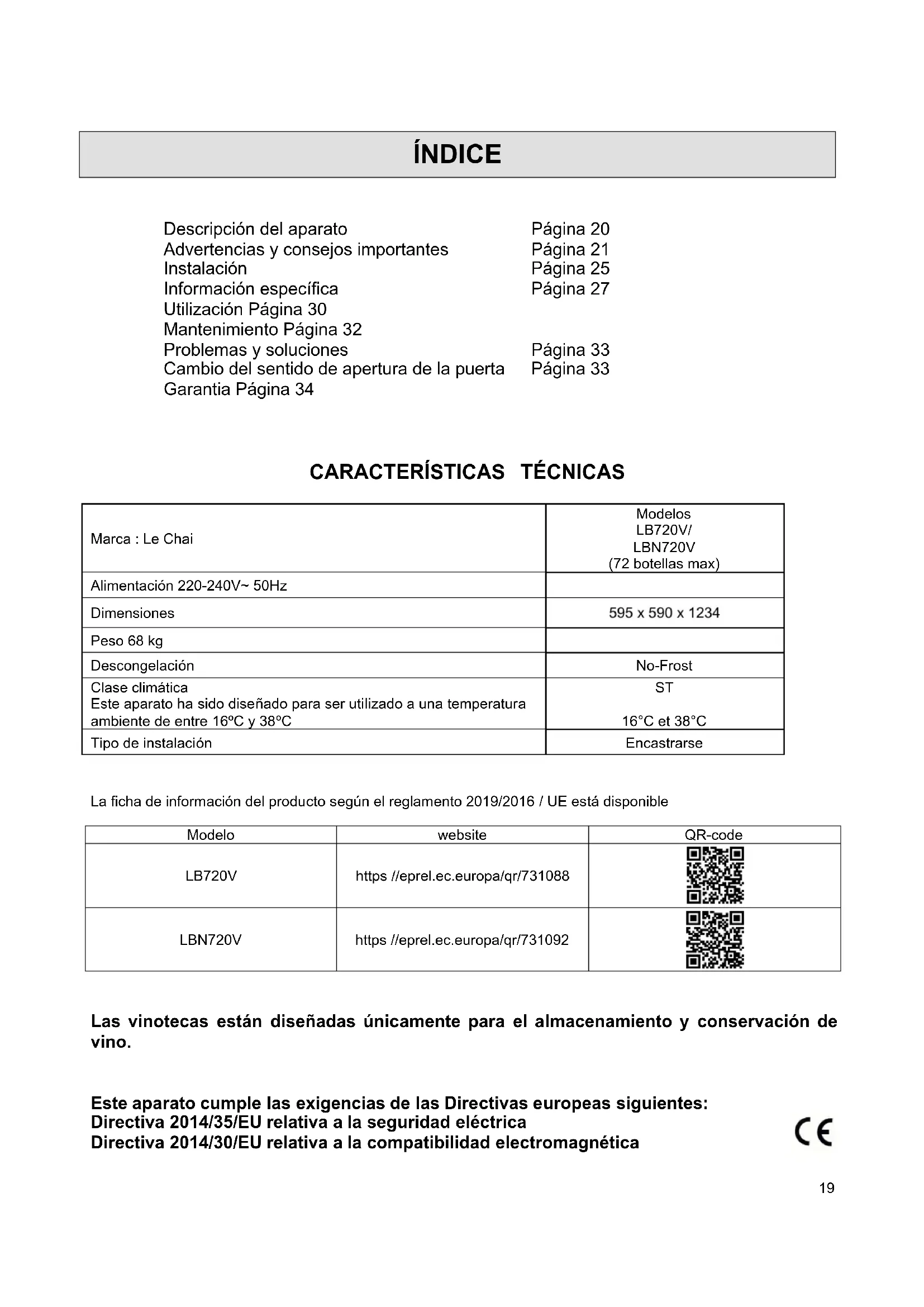 16°C et 38°C Tipo de instalación Encastrarse La ficha de información del producto según el reglamento 2019/2016 / UE está disponible Modelo website QR-code LB720V https //eprel.ec.europa/qr/731088 LBN720V https //eprel.ec.europa/qr/731092 Las vinotecas están diseñadas únicamente para el almacenamiento y conservación de vino. Este aparato cumple las exigencias de las Directivas europeas siguientes: Directiva 2014/35/EU relativa a la seguridad eléctrica Directiva 2014/30/EU relativa a la compatibilidad electromagnética20