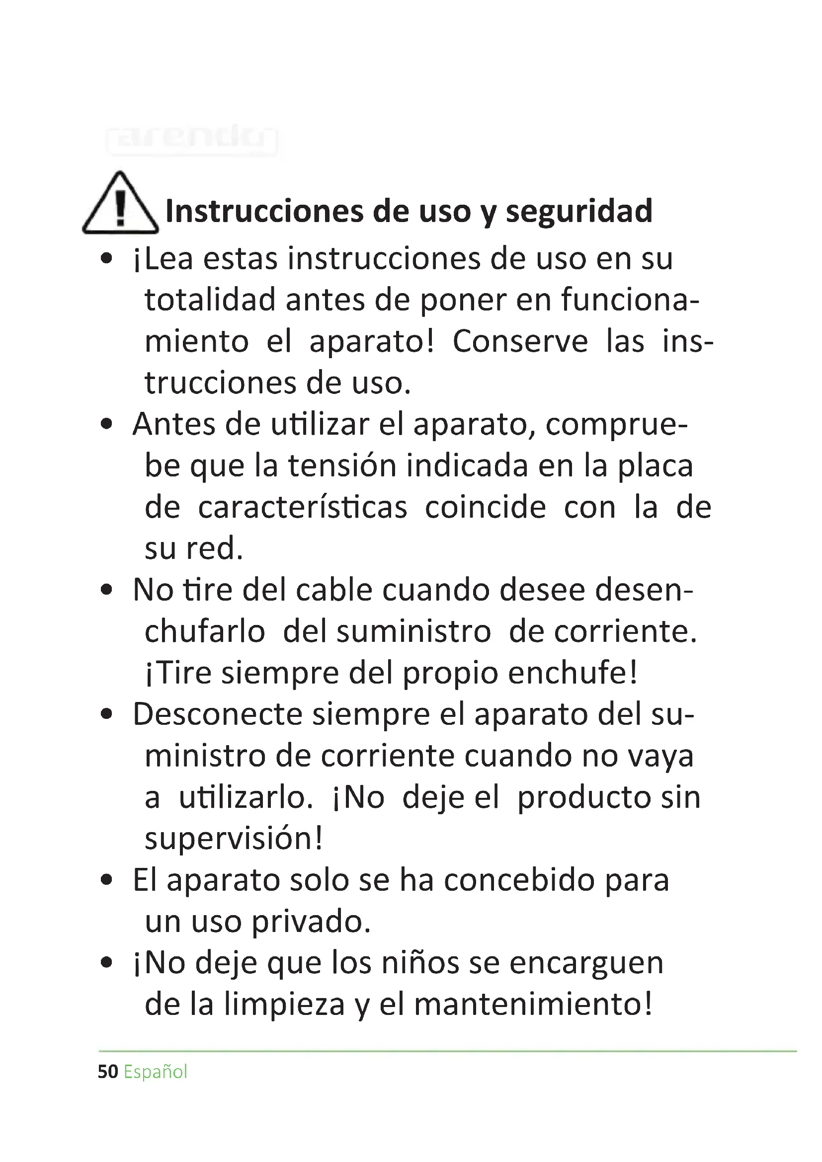 - ¡Tenga cuidado y no introduzca nunca partes del cuerpo en el aparato!55Español Gracias por escoger un producto de Arendo. Para que pueda disfrutar de su adquisición, le rogamos que lea atentamente las siguientes instrucciones de uso.