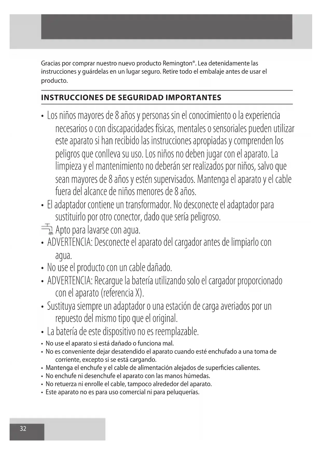 AE32 Gracias por comprar nuestro nuevo producto Remington®. Lea detenidamente las instrucciones y guárdelas en un lugar seguro. Retire todo el embalaje antes de usar el producto.