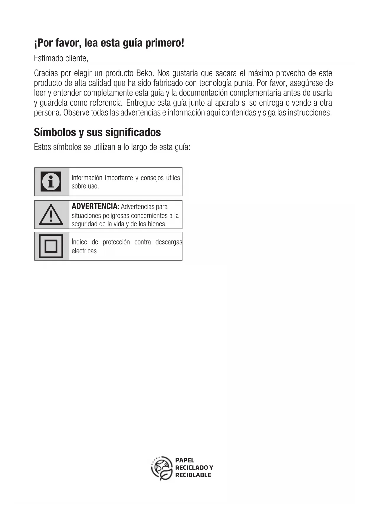 dodatkowo i nie wyłącza, nie ogranicza ani nie zawiesza uprawnień Użytkownika wynika- jących z przepisów o rękojmi za wady rzeczy sprzedanej na podstawie Kodeksu cywilnego.¡Por favor, lea esta guía primero! Estimado cliente, Gracias por elegir un producto Beko. Nos gustaría que sacara el máximo provecho de este producto de alta calidad que ha sido fabricado con tecnología punta. Por favor, asegúrese de leer y entender completamente esta guía y la documentación complementaria antes de usarla y guárdela como referencia. Entregue esta guía junto al aparato si se entrega o vende a otra persona. Observe todas las advertencias e información aquí contenidas y siga las instrucciones. Símbolos y sus significados Estos símbolos se utilizan a lo largo de esta guía: