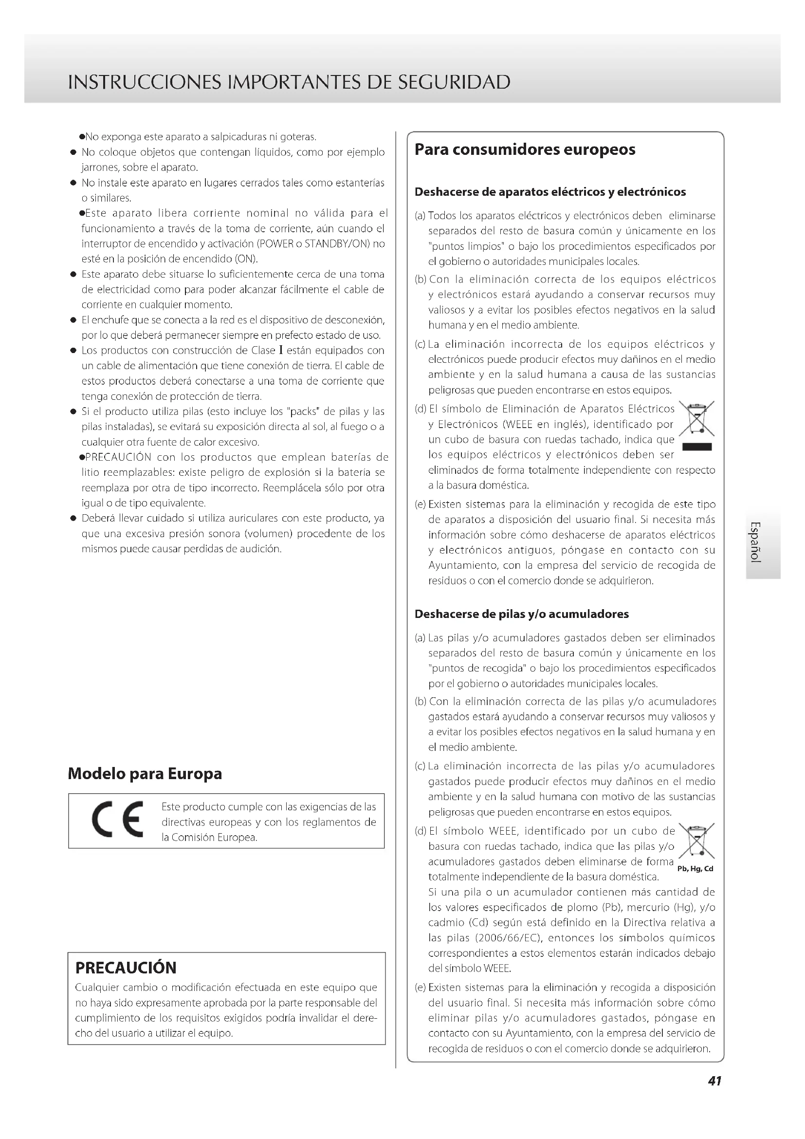 Para consumidores europeos Deshacerse de aparatos eléctricos y electrónicos (a) Todos los aparatos eléctricos y electrónicos deben eliminarse separados del resto de basura común y únicamente en los "puntos limpios" o bajo los procedimientos especificados por el gobierno o autoridades municipales locales. (b) Con la eliminación correcta de los equipos eléctricos y electrónicos estará ayudando a conservar recursos muy valiosos y a evitar los posibles efectos negativos en la salud humana y en el medio ambiente. (c) La eliminación incorrecta de los equipos eléctricos y electrónicos puede producir efectos muy dañinos en el medio ambiente y en la salud humana a causa de las sustancias peligrosas que pueden encontrarse en estos equipos. (d) El símbolo de Eliminación de Aparatos Eléctricos y Electrónicos (WEEE en inglés), identificado por un cubo de basura con ruedas tachado, indica que los equipos eléctricos y electrónicos deben ser eliminados de forma totalmente independiente con respecto a la basura doméstica. (e) Existen sistemas para la eliminación y recogida de este tipo de aparatos a disposición del usuario final. Si necesita más información sobre cómo deshacerse de aparatos eléctricos y electrónicos antiguos, póngase en contacto con su Ayuntamiento, con la empresa del servicio de recogida de residuos o con el comercio donde se adquirieron. Deshacerse de pilas y/o acumuladores (a) Las pilas y/o acumuladores gastados deben ser eliminados separados del resto de basura común y únicamente en los "puntos de recogida" o bajo los procedimientos especificados por el gobierno o autoridades municipales locales. (b) Con la eliminación correcta de las pilas y/o acumuladores gastados estará ayudando a conservar recursos muy valiosos y a evitar los posibles efectos negativos en la salud humana y en el medio ambiente. (c) La eliminación incorrecta de las pilas y/o acumuladores gastados puede producir efectos muy dañinos en el medio ambiente y en la salud humana con motivo de las sustancias peligrosas que pueden encontrarse en estos equipos. (d) El símbolo WEEE, identificado por un cubo de basura con ruedas tachado, indica que las pilas y/o acumuladores gastados deben eliminarse de forma totalmente independiente de la basura doméstica. Si una pila o un acumulador contienen más cantidad de los valores especificados de plomo (Pb), mercurio (Hg), y/o cadmio (Cd) según está definido en la Directiva relativa a las pilas (2006/66/EC), entonces los símbolos químicos correspondientes a estos elementos estarán indicados debajo del símbolo WEEE. (e) Existen sistemas para la eliminación y recogida a disposición del usuario final. Si necesita más información sobre cómo eliminar pilas y/o acumuladores gastados, póngase en contacto con su Ayuntamiento, con la empresa del servicio de recogida de residuos o con el comercio donde se adquirieron. Pb, Hg, Cd4242 Índice Gracias por adquirir este producto Esoteric. Lea detenidamente este manual para obtener el mejor rendimiento posible de este producto. Antes de su utilización Qué hay en la caja Asegúrese de que la caja incluye todos los accesorios suministrados que se muestran a continuación. Por favor, póngase en contacto con el establecimiento donde adquirió este producto si falta cualquiera de estos accesorios o si han sufrido desperfectos durante el transporte. Cable de corriente × 1 Almohadillas de fieltro × 4 Cable HDMI × 1 Tarjeta de garantía × 1 Manual del usuario (este documento) × 1 o Después de leer este manual, guárdelo en un lugar seguro, junto con la tarjeta de garantía, por si lo necesita en el futuro.