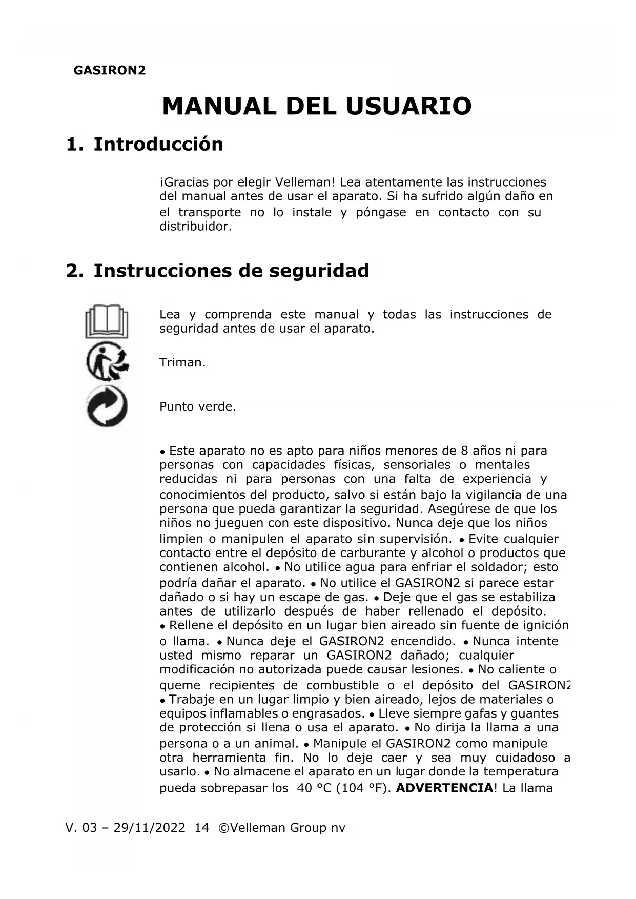 Encuentra gratis el manual del aparato GASIRON2 VELLEMAN en formato PDF.