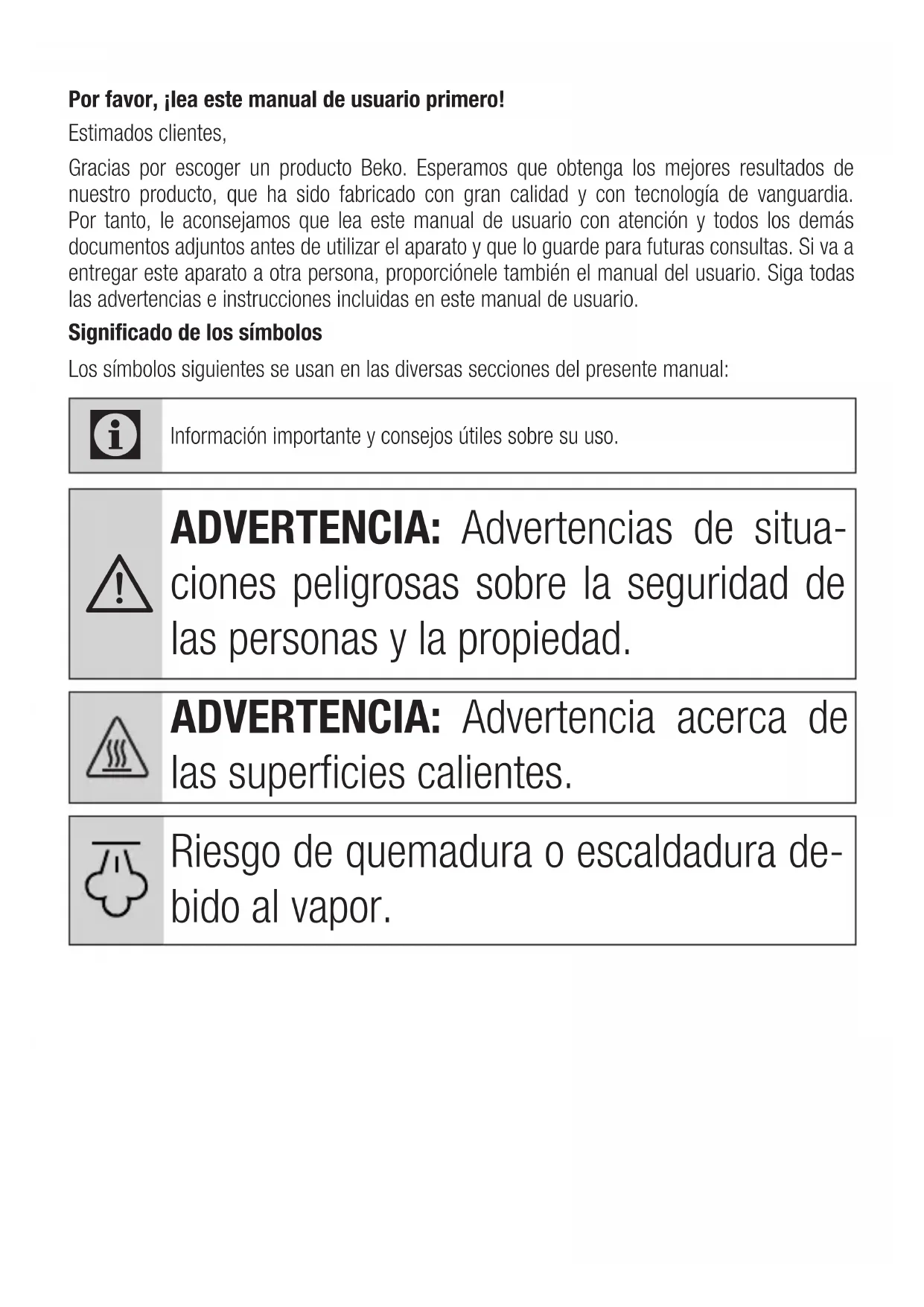 - Soyez prudent et vaporisez autour des accessoires métalliques. 4 DépannagePor favor, ¡lea este manual de usuario primero! Estimados clientes, Gracias por escoger un producto Beko. Esperamos que obtenga los mejores resultados de nuestro producto, que ha sido fabricado con gran calidad y con tecnología de vanguardia. Por tanto, le aconsejamos que lea este manual de usuario con atención y todos los demás documentos adjuntos antes de utilizar el aparato y que lo guarde para futuras consultas. Si va a entregar este aparato a otra persona, proporciónele también el manual del usuario. Siga todas las advertencias e instrucciones incluidas en este manual de usuario. Significado de los símbolos Los símbolos siguientes se usan en las diversas secciones del presente manual: