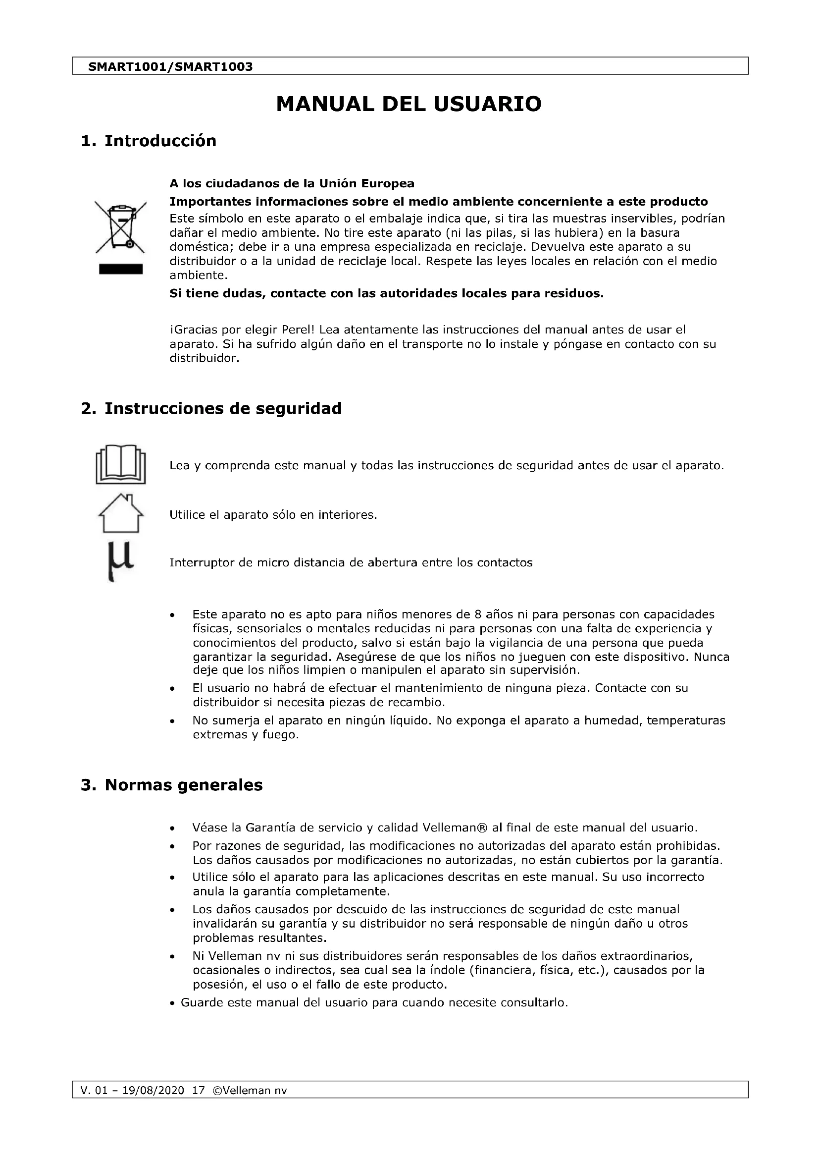 Velleman NV dispone de los derechos de autor para este manual del usuario. Todos los derechos mundiales reservados. Está estrictamente prohibido reproducir, traducir, copiar, editar y guardar este manual del usuario o partes de ello sin el consentimiento previo por escrito del propietario del copyright.SMART1001/SMART1003