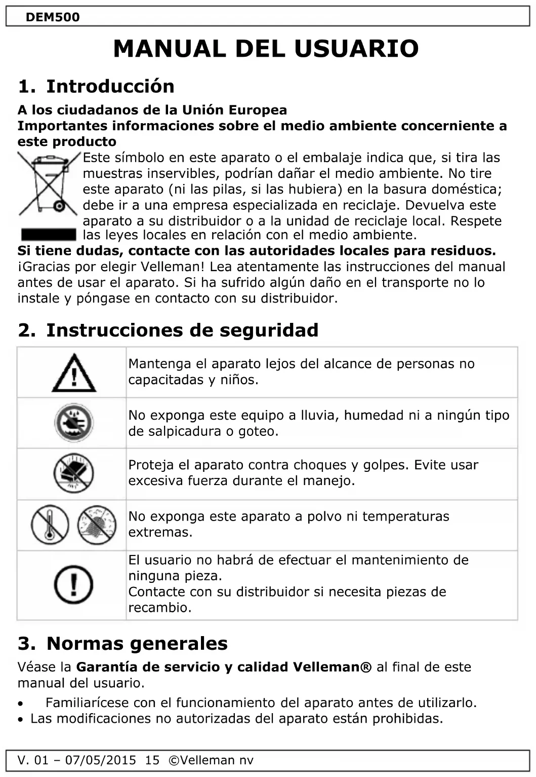 Véase la Garantía de servicio y calidad Velleman® al final de este manual del usuario. Familiarícese con el funcionamiento del aparato antes de utilizarlo. Las modificaciones no autorizadas del aparato están prohibidas.DEM500