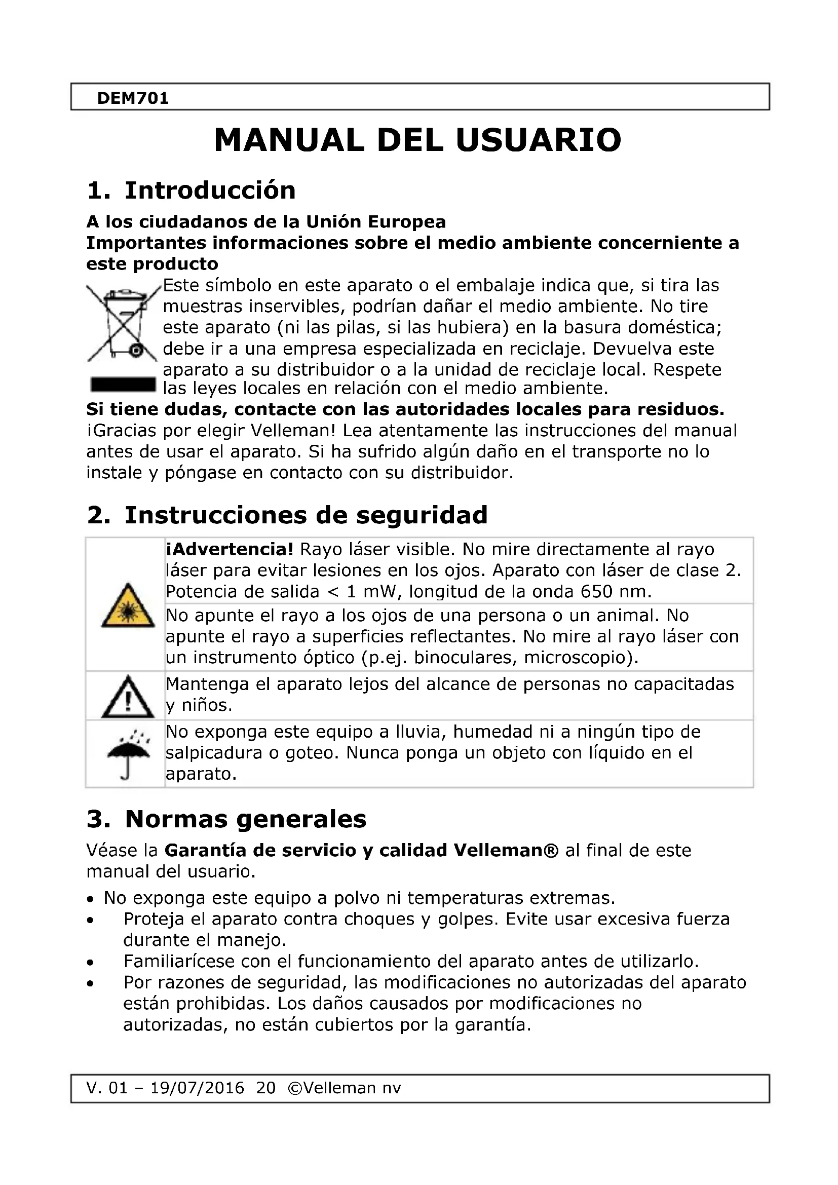 Véase la Garantía de servicio y calidad Velleman® al final de este manual del usuario. No exponga este equipo a polvo ni temperaturas extremas. Proteja el aparato contra choques y golpes. Evite usar excesiva fuerza durante el manejo. Familiarícese con el funcionamiento del aparato antes de utilizarlo. Por razones de seguridad, las modificaciones no autorizadas del aparato están prohibidas. Los daños causados por modificaciones no autorizadas, no están cubiertos por la garantía.DEM701