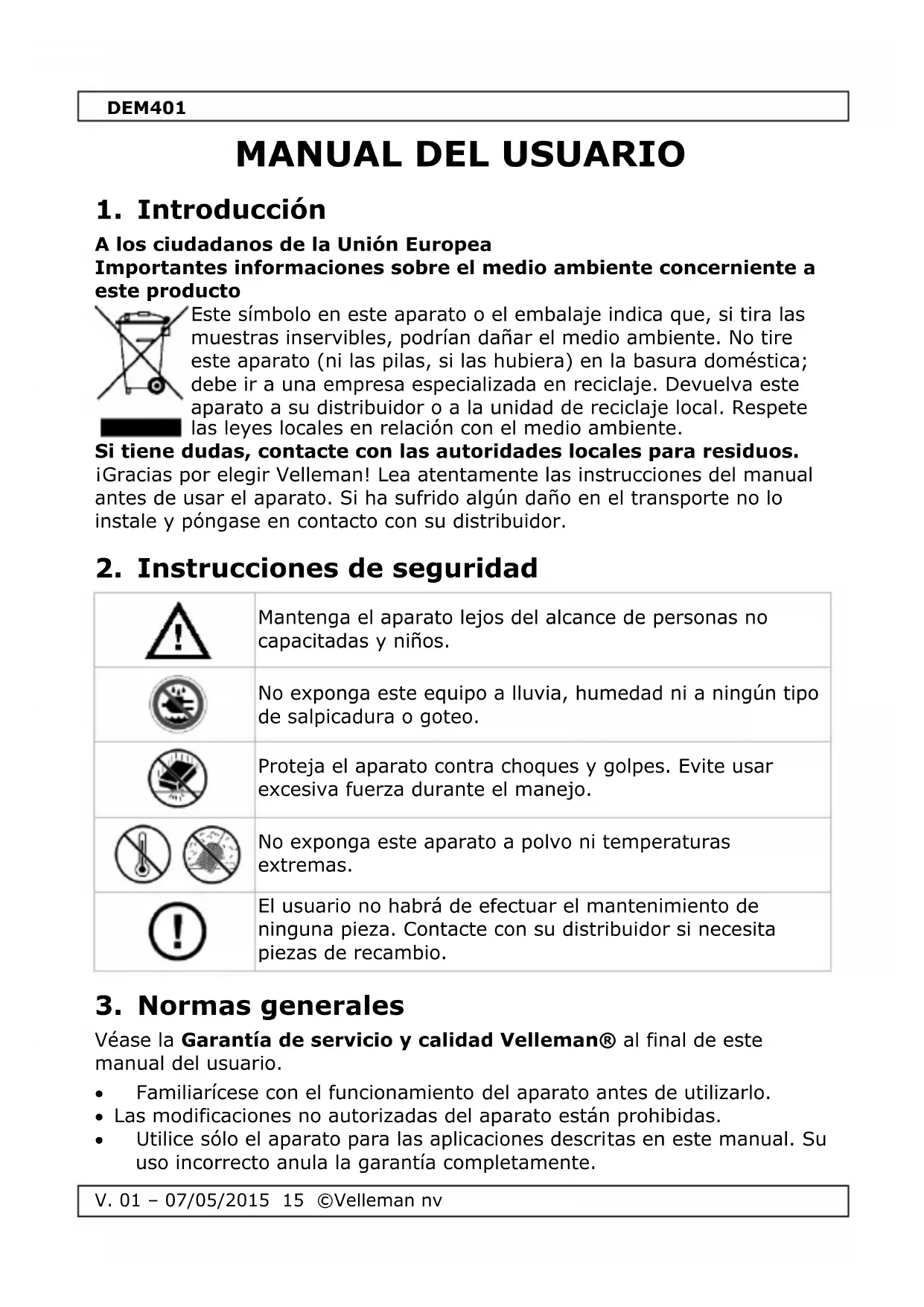 Véase la Garantía de servicio y calidad Velleman® al final de este manual del usuario. Familiarícese con el funcionamiento del aparato antes de utilizarlo. Las modificaciones no autorizadas del aparato están prohibidas. Utilice sólo el aparato para las aplicaciones descritas en este manual. Su uso incorrecto anula la garantía completamente.DEM401
