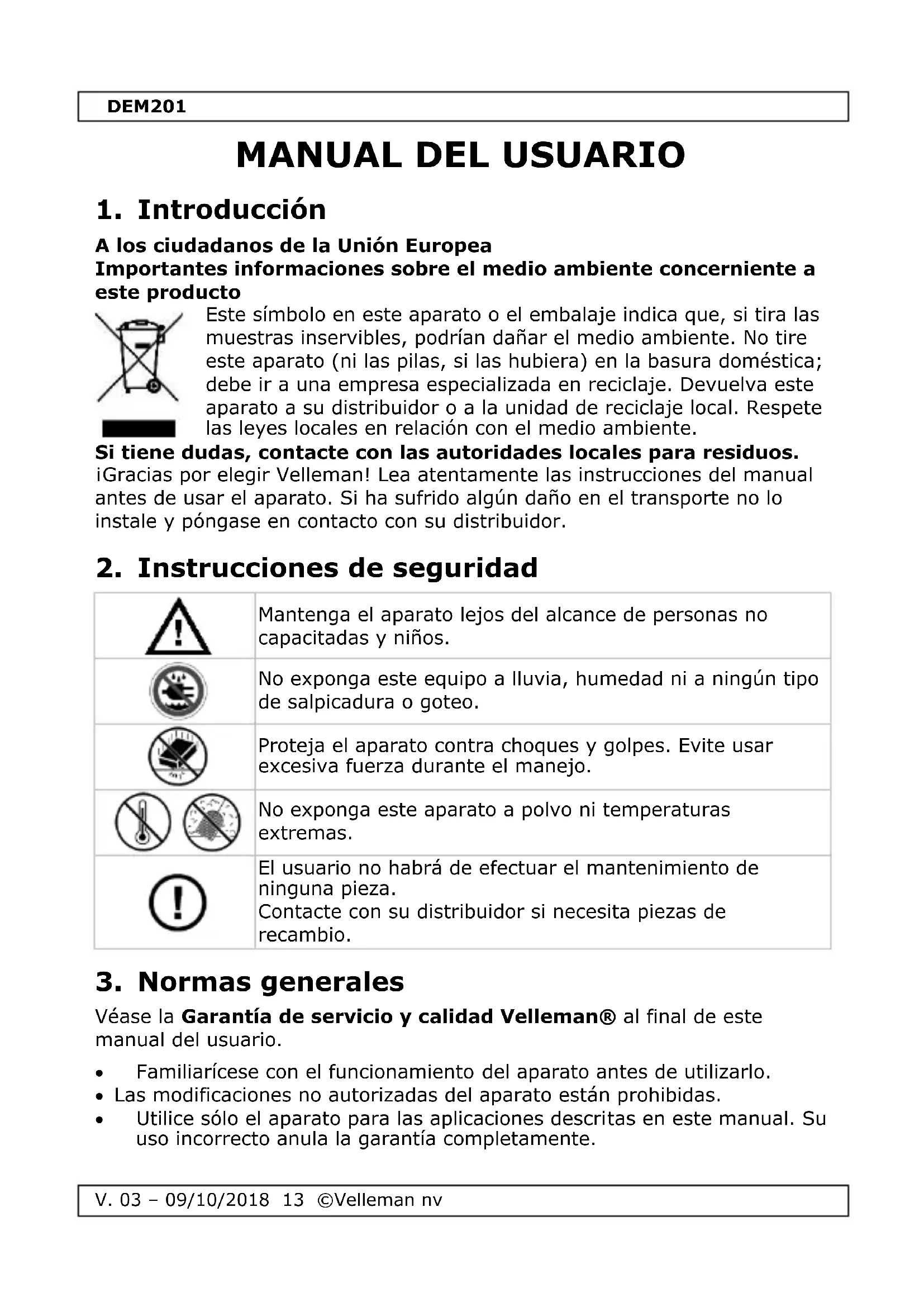 Véase la Garantía de servicio y calidad Velleman® al final de este manual del usuario. Familiarícese con el funcionamiento del aparato antes de utilizarlo. Las modificaciones no autorizadas del aparato están prohibidas. Utilice sólo el aparato para las aplicaciones descritas en este manual. Su uso incorrecto anula la garantía completamente.DEM201