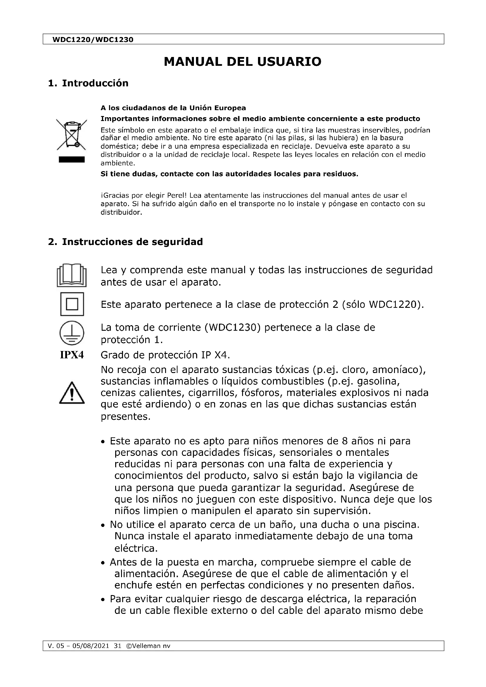 Velleman NV dispone de los derechos de autor para este manual del usuario. Todos los derechos mundiales reservados. Está estrictamente prohibido reproducir, traducir, copiar, editar y guardar este manual del usuario o partes de ello sin el consentimiento previo por escrito del propietario del copyright.WDC1220/WDC1230