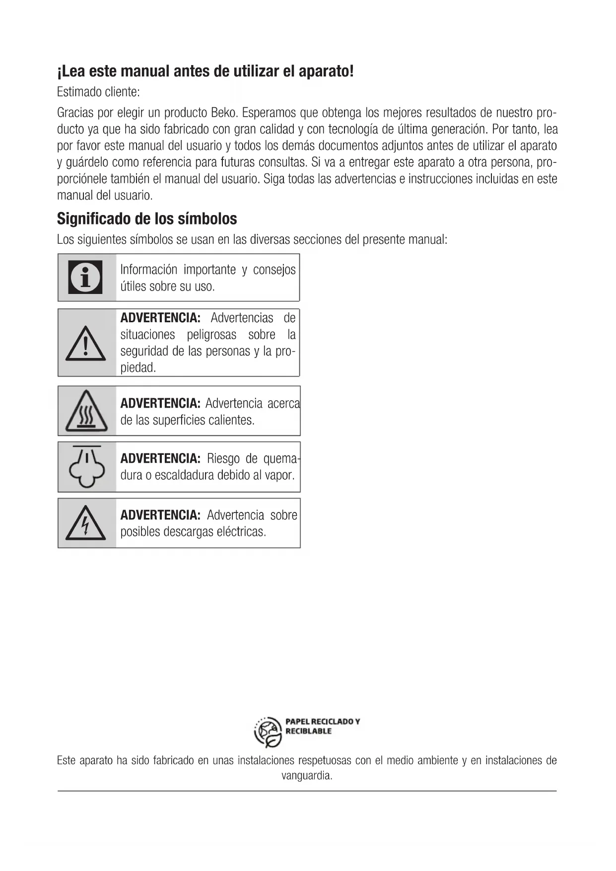 ADVERTENCIA: Advertencia sobre posibles descargas eléctricas. Este aparato ha sido fabricado en unas instalaciones respetuosas con el medio ambiente y en instalaciones de vanguardia.Centro de planchado / Manual del usuario 53 / ES