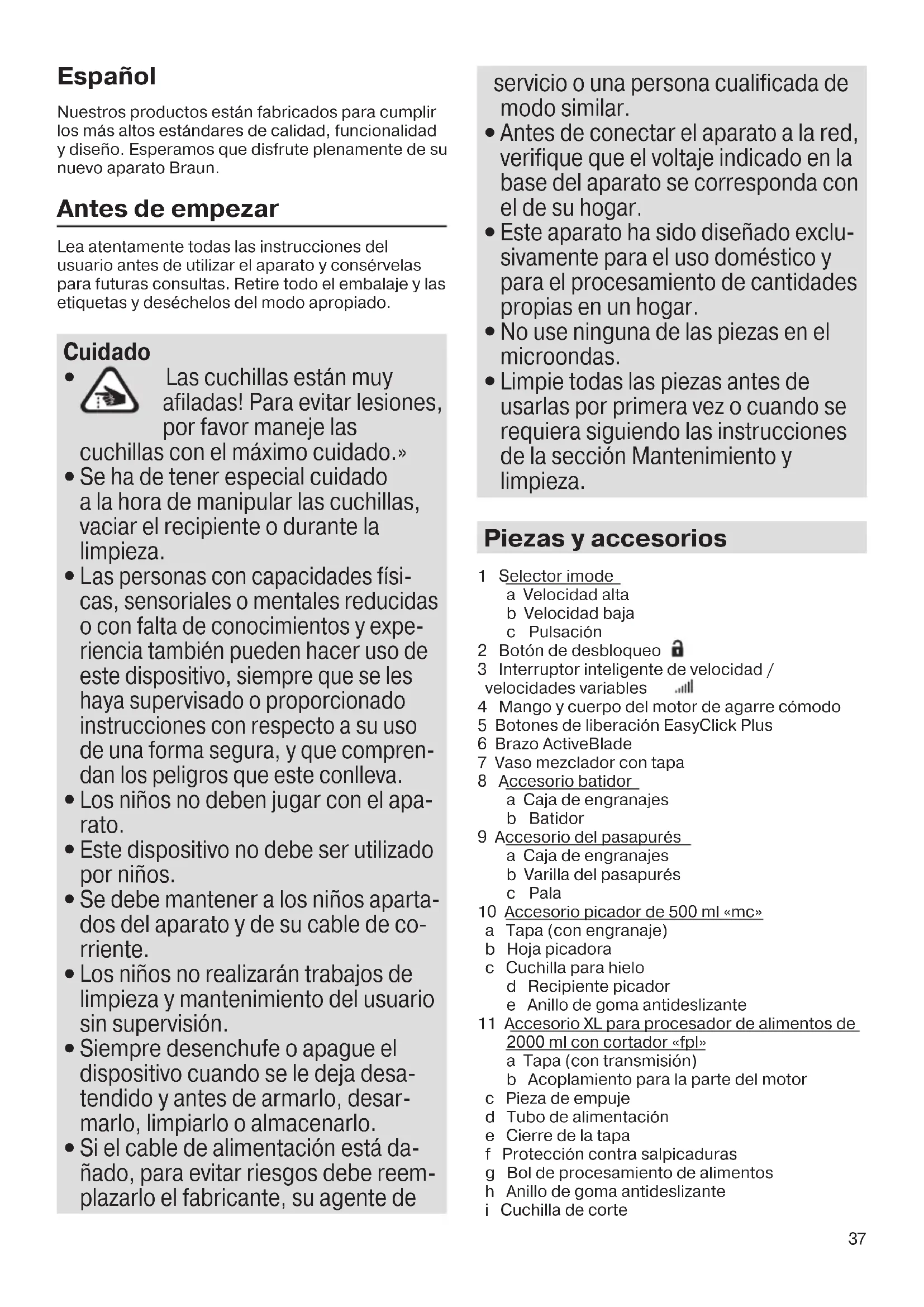 - Las cuchillas son muy afiladas. Coja las piezas solamente por los componentes de plástico.