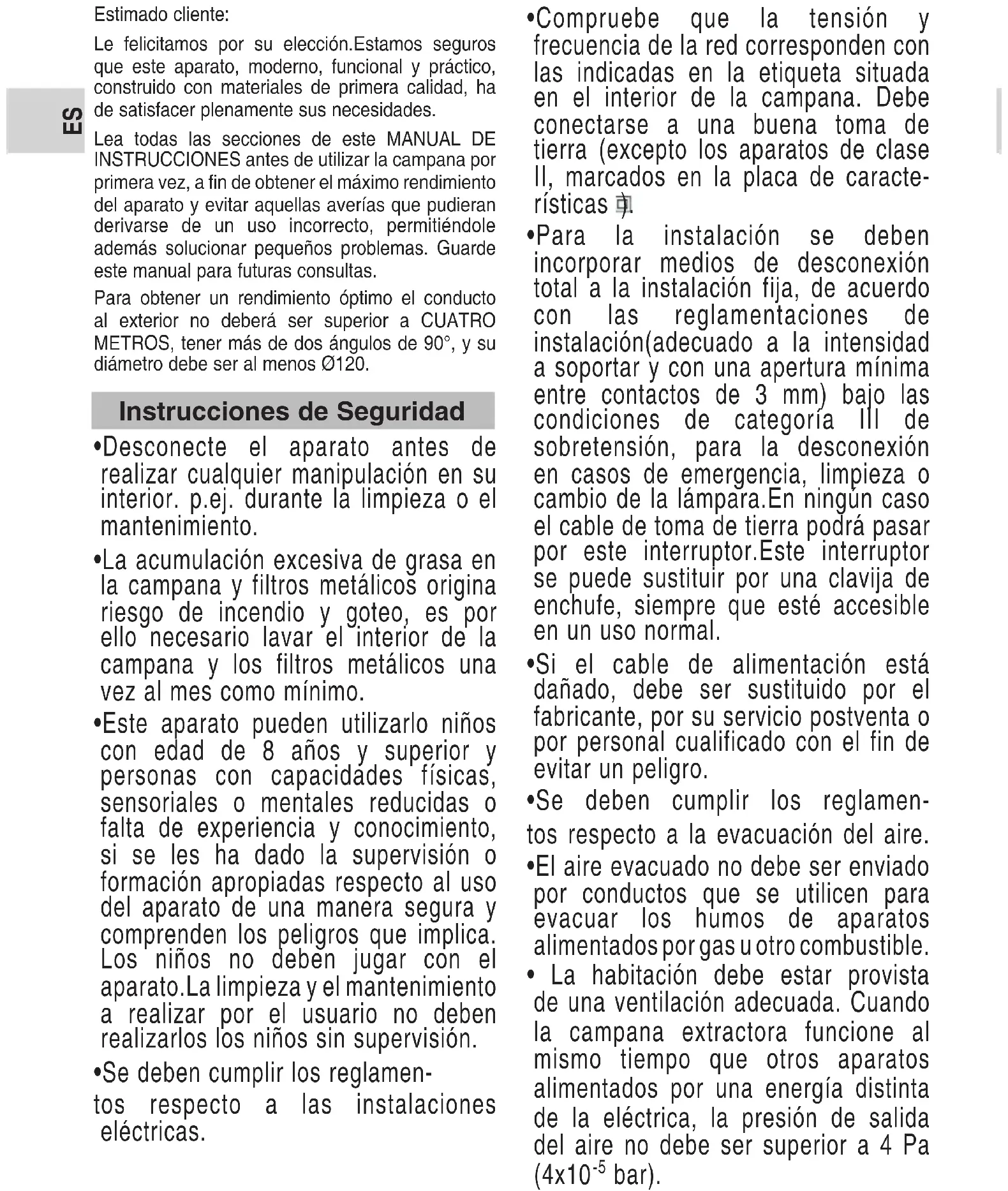 1x8ES Estimado cliente: Le felicitamos por su elección.Estamos seguros que este aparato, moderno, funcional y práctico, construido con materiales de primera calidad, ha de satisfacer plenamente sus necesidades. Lea todas las secciones de este MANUAL DE INSTRUCCIONES antes de utilizar la campana por primera vez, a fin de obtener el máximo rendimiento del aparato y evitar aquellas averías que pudieran derivarse de un uso incorrecto, permitiéndole además solucionar pequeños problemas. Guarde este manual para futuras consultas. Para obtener un rendimiento óptimo el conducto al exterior no deberá ser superior a CUATRO METROS, tener más de dos ángulos de 90°, y su diámetro debe ser al menos Ø120.