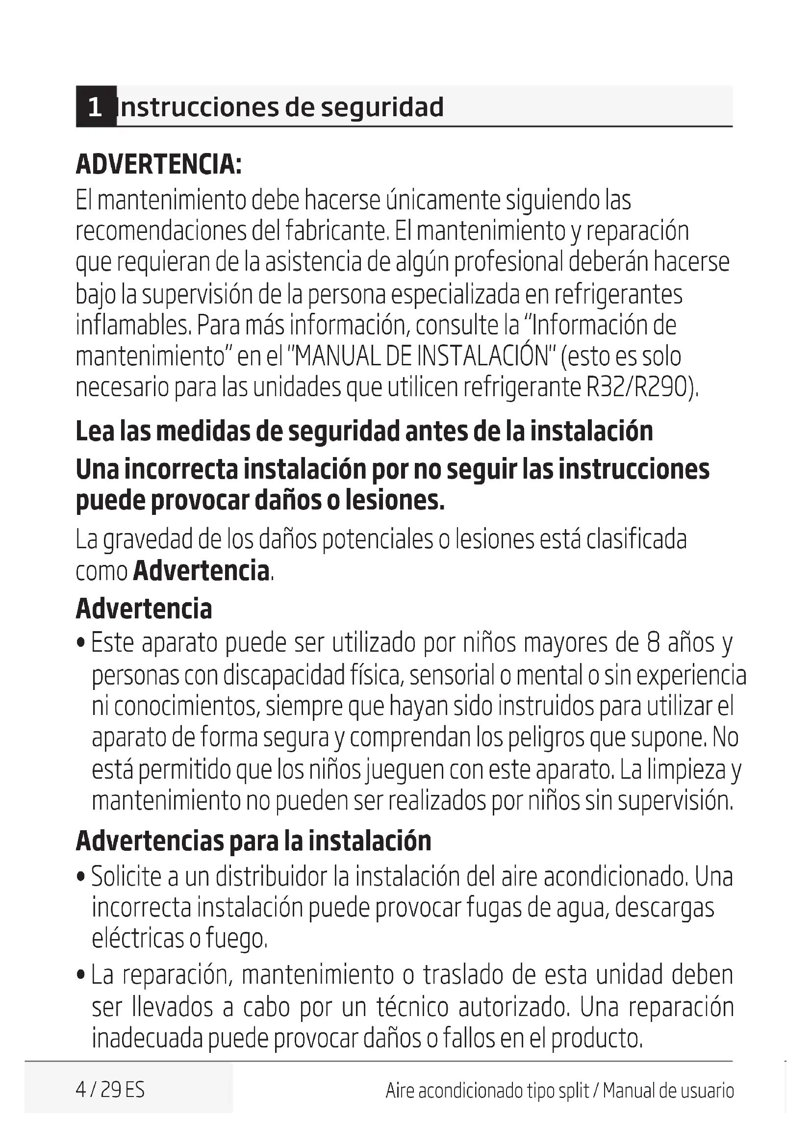 3 / 29 ESAire acondicionado tipo split / Manual de usuario 1 Instrucciones de seguridad ADVERTENCIA: El mantenimiento debe hacerse únicamente siguiendo las recomendaciones del fabricante. El mantenimiento y reparación que requieran de la asistencia de algún profesional deberán hacerse bajo la supervisión de la persona especializada en refrigerantes inflamables. Para más información, consulte la “Información de mantenimiento” en el "MANUAL DE INSTALACIÓN" (esto es solo necesario para las unidades que utilicen refrigerante R32/R290). Lea las medidas de seguridad antes de la instalación Una incorrecta instalación por no seguir las instrucciones puede provocar daños o lesiones. La gravedad de los daños potenciales o lesiones está clasificada como Advertencia. Advertencia t Este aparato puede ser utilizado por niños mayores de 8 años y personas con discapacidad física, sensorial o mental o sin experiencia ni conocimientos, siempre que hayan sido instruidos para utilizar el aparato de forma segura y comprendan los peligros que supone. No está permitido que los niños jueguen con este aparato. La limpieza y mantenimiento no pueden ser realizados por niños sin supervisión. Advertencias para la instalación t Solicite a un distribuidor la instalación del aire acondicionado. Una incorrecta instalación puede provocar fugas de agua, descargas eléctricas o fuego. t La reparación, mantenimiento o traslado de esta unidad deben ser llevados a cabo por un técnico autorizado. Una reparación inadecuada puede provocar daños o fallos en el producto. 4 / 29 ESAire acondicionado tipo split / Manual de usuario Advertencias de utilización t De darse una situación poco habitual (como un olor a quemado), apague inmediatamente la unidad y desconéctela. Llame a su distribuidor para evitar descargas eléctricas, fuego u otros daños. t No introduzca los dedos, varillas ni otros objetos en la entrada o salida de aire. Esto puede provocar daños, ya que el ventilador podría estar en funcionamiento. t No utilice espráis inflamables, como aerosoles para el pelo, laca o pintura cerca de la unidad. Esto puede provocar fuego o combustión. t No ponga en marcha el aire acondicionado en lugares con gases combustibles cercanos. El gas emitido puede acumularse en torno a la unidad y provocar una explosión. t No ponga en marcha el aire acondicionado en habitaciones con humedad (p. ej., un baño o una lavandería). Esto puede provocar descargas eléctricas y causarle daños al producto. t No se exponga directamente al aire frío por un periodo de tiempo prolongado. Advertencias eléctricas t Utilice únicamente el cable especificado. Si el cable está dañado, deberá ser reemplazado por el fabricante o un agente autorizado. t Mantenga el enchufe limpio. Elimine el polvo o suciedad acumulados en torno al enchufe. Los enchufes con suciedad pueden provocar fuego o descargas eléctricas. t No tire del cable para desconectar la unidad. Sujete el enchufe firmemente y tire de él. Tirar del cable directamente puede dañarlo y provocar fuego o descargas eléctricas. 1 Instrucciones de seguridad 5 / 29 ESAire acondicionado tipo split / Manual de usuario t No use un alargador, ni extienda el cable de forma manual, ni conecte otros aparatos en el mismo enchufe que el aire acondicionado. Una conexión eléctrica o aislamiento deficientes pueden provocar fuego. Advertencias de limpieza y mantenimiento t Apague y desenchufe el aparato antes de limpiarlo. No hacerlo podría provocar descargas eléctricas. t No limpie el aire acondicionado con cantidades de agua excesivas. t No limpie el aire acondicionado con productos de limpieza combustibles. Los productos de limpieza combustibles pueden provocar fuego o deformación. Advertencia t Si se usa el aire acondicionado con cocinas u otros aparatos de calefacción, ventile bien la habitación para evitar la falta de oxígeno. t Apague el aire acondicionado y desenchufe la unidad si no va a utilizarla en mucho tiempo. t Apague y desenchufe la unidad cuando haya tormenta. t Asegúrese de que la condensación de agua pueda salir libremente de la unidad. t No ponga en marcha el aire acondicionado con las manos húmedas. Esto puede provocar descargas eléctricas. t No utilice el aparato para ningún otro propósito que el suyo específico. t No se suba, ni coloque objetos sobre la unidad exterior. t No deje funcionando el aire acondicionado durante largos periodos de tiempo con puertas o ventanas abiertas, o si la humedad es muy alta. 1 Instrucciones de seguridad 6 / 29 ESAire acondicionado tipo split / Manual de usuario
