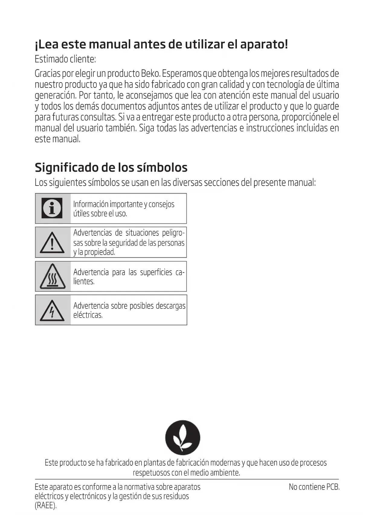 Estmado clente: Gracas por elegr un producto Beko. Esperamos que obtenga los mejores resultados de nuestro producto ya que ha sdo fabrcado con gran caldad y con tecnología de últma generacón. Por tanto, le aconsejamos que lea con atencón este manual del usuaro y todos los demás documentos adjuntos antes de utlzar el producto y que lo guarde para futuras consultas. S va a entregar este producto a otra persona, proporcónele el manual del usuaro tambén. Sga todas las advertencas e nstruccones ncludas en este manual. Significado de los símbolos Los sguentes símbolos se usan en las dversas seccones del presente manual: