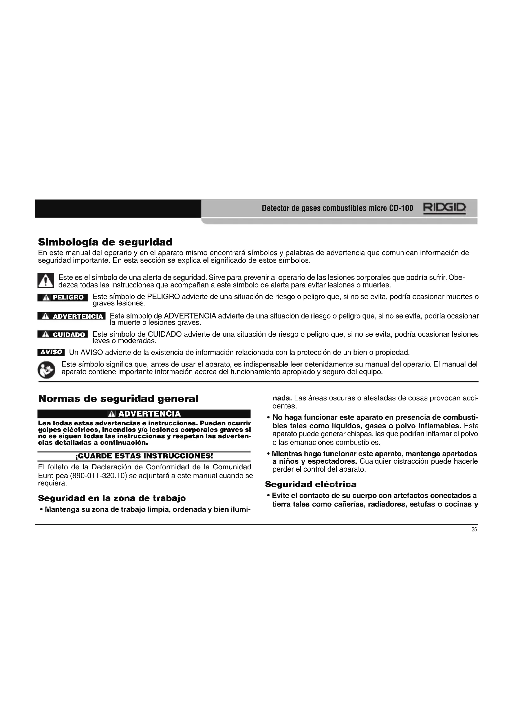 una herramienta que localiza fugas de gases. Eficazmente husmea la presencia de ciertos gases como el metano, propano, butano, amoníaco y otros (vea en la página 5 una lista más completa), e in- dica las concentraciones relativas de gas. Es capaz de advertir, en segundos, la presencia hasta de muy bajas concentraciones de un gas inflama ble. El micro de CD-100 detecta concentraciones de gas a través del uso de un sensor interno. Durante su funcionamiento este sensor se calienta y a medida que interactúa con los gases, el aparato le in- dica de inmediato al usuario de que hay presentes gases com- bustibles. El micro de CD-100 manifiesta la presencia de gases combustibles mediante efectos visuales, de audio y vibratorios. Cuenta con cinco (5) niveles de medición dentro de sus dos posi- ciones (baja y alta) de sensibilidad. Cuando el aparato detecta la presencia de un gas combustible, alerta al operario ya sea parpa - deando determinadas luces, emitiendo determinados sonidos audi- bles o vibrando. El micro CD-100 trae acoplada una sonda flexible de 40,7 cms. (16 pulgs.) de largo. Especificaciones Alerta visual. .................................5 diodos emisores de luz (DEL) rojos: niveles de medición de gases; alerta visual de sensibilidad Alerta audible (85 db) ...................tictac sonoro (con modulación continua proporcional al nivel de gas detectado) Antes de usar este Detector de gases combustibles micro CD-100, lea estas precauciones detenidamente para evitar incen-dios, explosiones y graves lesiones. ¡GUARDE ESTAS INSTRUCCIONES! Mantenga este manual junto al aparato, a la mano del operario. Seguridad del Detector de gases combustibles