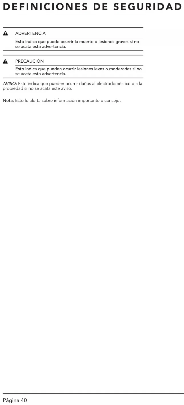 ADVERTENCIA Esto indica que puede ocurrir la muerte o lesiones graves si no se acata esta advertencia. PRECAUCIÓN Esto indica que pueden ocurrir lesiones leves o moderadas si no se acata esta advertencia. AVISO: Esto indica que pueden ocurrir daños al electrodoméstico o a la propiedad si no se acata este aviso. Nota: Esto lo alerta sobre información importante o consejos.Página 41