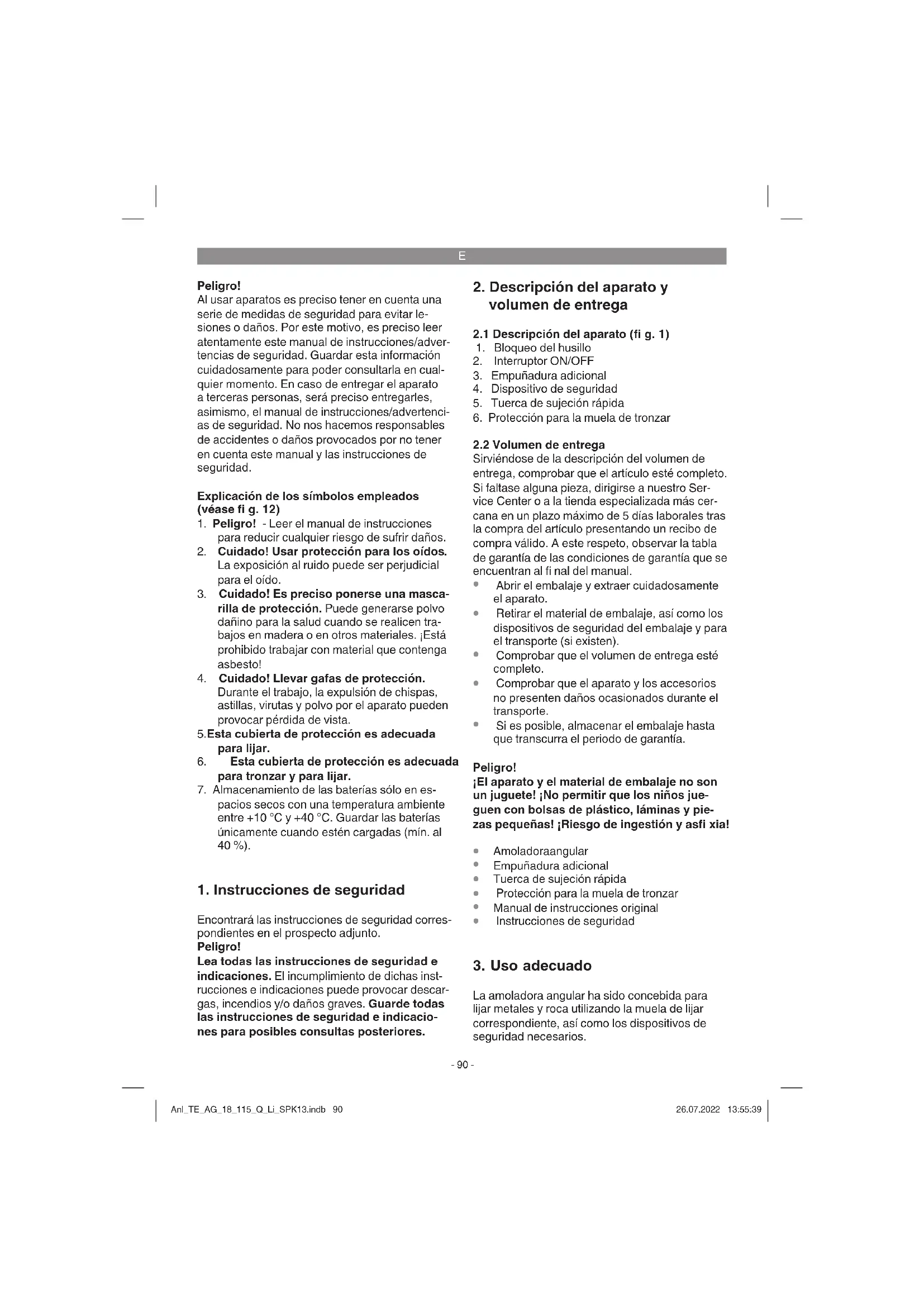 La amoladora angular ha sido concebida para lijar metales y roca utilizando la muela de lijar correspondiente, así como los dispositivos de seguridad necesarios. Anl_TE_AG_18_115_Q_Li_SPK13.indb 90Anl_TE_AG_18_115_Q_Li_SPK13.indb 90 26.07.2022 13:55:3926.07.2022 13:55:39E