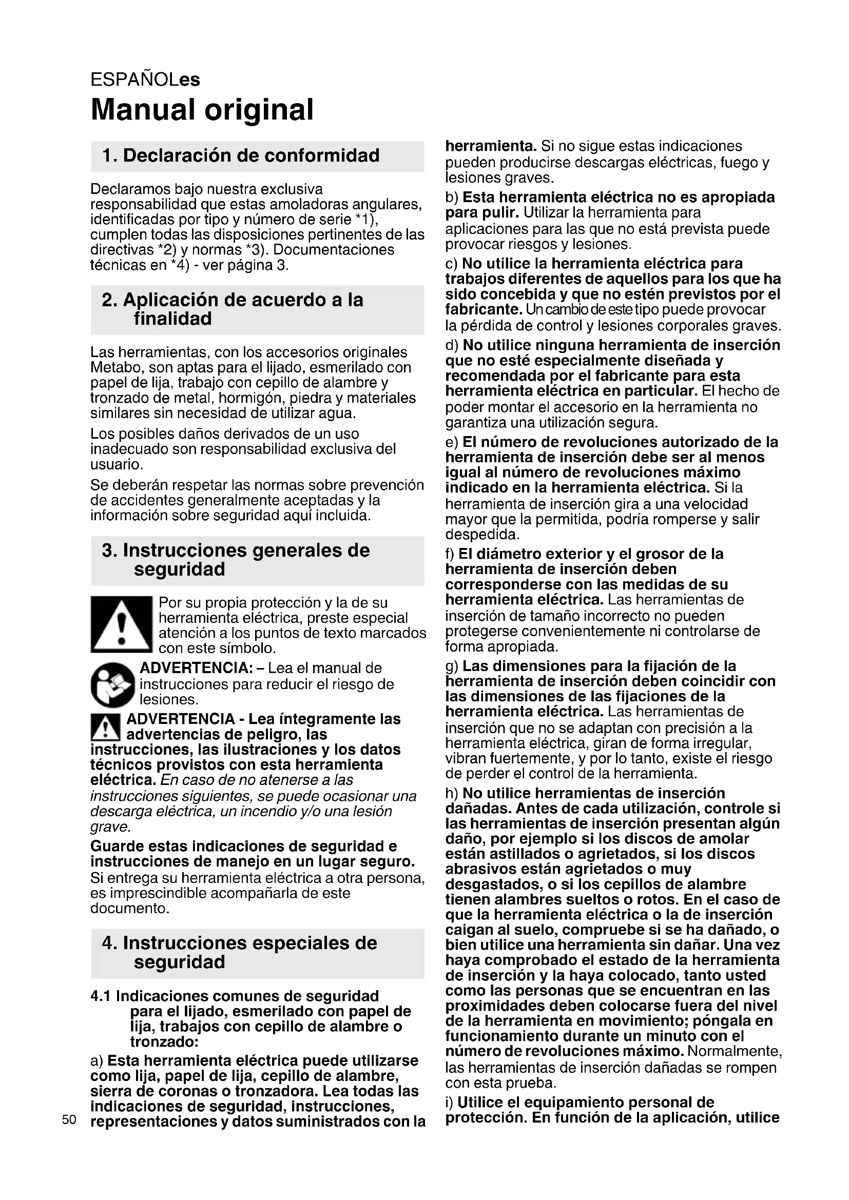 Manual original Declaramos bajo nuestra exclusiva responsabilidad que estas amoladoras angulares, identificadas por tipo y número de serie *1), cumplen todas las disposiciones pertinentes de las directivas *2) y normas *3). Documentaciones técnicas en *4) - ver página 3. Las herramientas, con los accesorios originales Metabo, son aptas para el lijado, esmerilado con papel de lija, trabajo con cepillo de alambre y tronzado de metal, hormigón, piedra y materiales similares sin necesidad de utilizar agua. Los posibles daños derivados de un uso inadecuado son responsabilidad exclusiva del usuario. Se deberán respetar las normas sobre prevención de accidentes generalmente aceptadas y la información sobre seguridad aquí incluida. Por su propia protección y la de su herramienta eléctrica, preste especial atención a los puntos de texto marcados con este símbolo. ADVERTENCIA: – Lea el manual de instrucciones para reducir el riesgo de lesiones. ADVERTENCIA - Lea íntegramente las advertencias de peligro, las instrucciones, las ilustraciones y los datos técnicos provistos con esta herramienta eléctrica. En caso de no atenerse a las instrucciones siguientes, se puede ocasionar una descarga eléctrica, un incendio y/o una lesión grave. Guarde estas indicaciones de seguridad e instrucciones de manejo en un lugar seguro. Si entrega su herramienta eléctrica a otra persona, es imprescindible acompañarla de este documento.