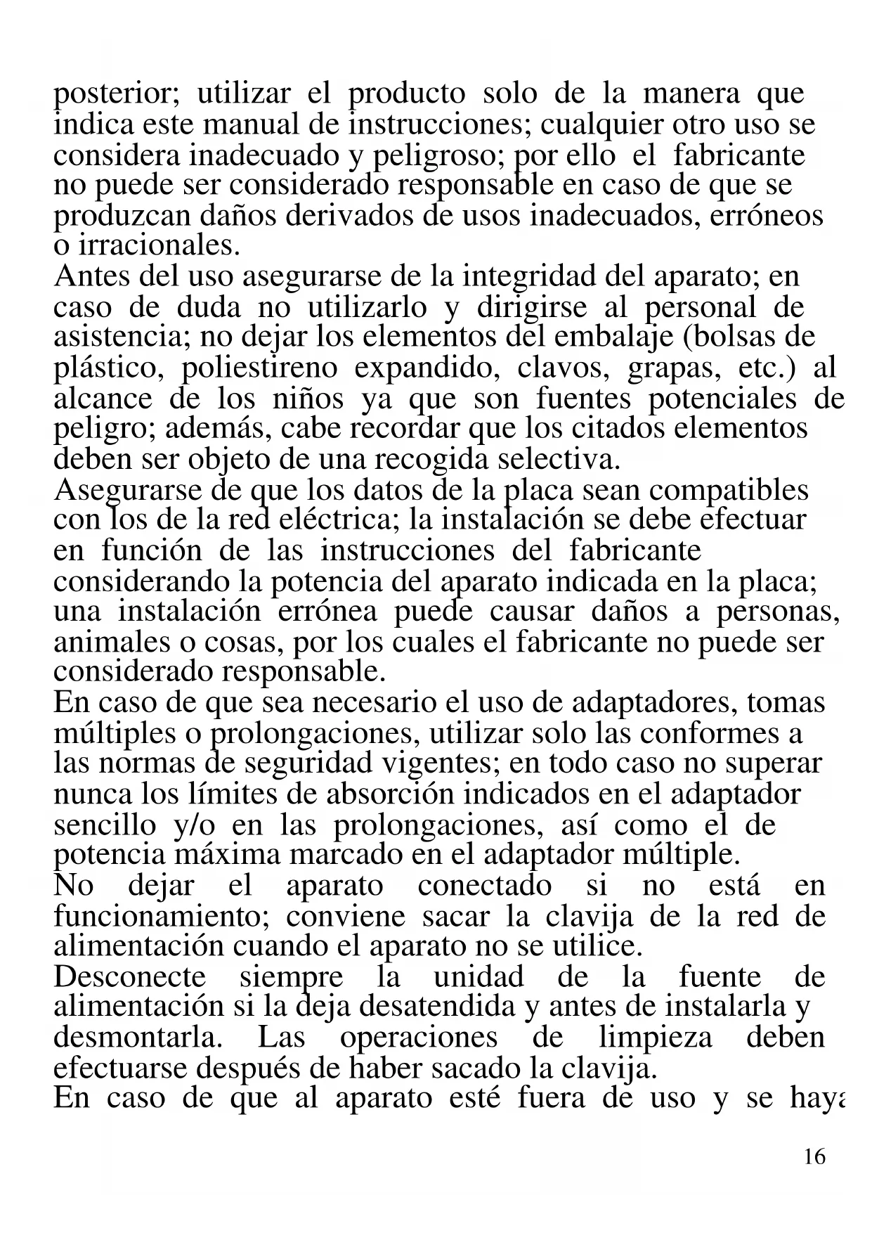 A continuación se presentan importantes indicaciones sobre la instalación, el uso y el mantenimiento. Conservar con cuidado este manual para cualquier consulta16 posterior; utilizar el producto solo de la manera que indica este manual de instrucciones; cualquier otro uso se considera inadecuado y peligroso; por ello el fabricante no puede ser considerado responsable en caso de que se produzcan daños derivados de usos inadecuados, erróneos o irracionales. Antes del uso asegurarse de la integridad del aparato; en caso de duda no utilizarlo y dirigirse al personal de asistencia; no dejar los elementos del embalaje (bolsas de plástico, poliestireno expandido, clavos, grapas, etc.) al alcance de los niños ya que son fuentes potenciales de peligro; además, cabe recordar que los citados elementos deben ser objeto de una recogida selectiva. Asegurarse de que los datos de la placa sean compatibles con los de la red eléctrica; la instalación se debe efectuar en función de las instrucciones del fabricante considerando la potencia del aparato indicada en la placa; una instalación errónea puede causar daños a personas, animales o cosas, por los cuales el fabricante no puede ser considerado responsable. En caso de que sea necesario el uso de adaptadores, tomas múltiples o prolongaciones, utilizar solo las conformes a las normas de seguridad vigentes; en todo caso no superar nunca los límites de absorción indicados en el adaptador sencillo y/o en las prolongaciones, así como el de potencia máxima marcado en el adaptador múltiple. No dejar el aparato conectado si no está en funcionamiento; conviene sacar la clavija de la red de alimentación cuando el aparato no se utilice. Desconecte siempre la unidad de la fuente de alimentación si la deja desatendida y antes de instalarla y desmontarla. Las operaciones de limpieza deben efectuarse después de haber sacado la clavija. En caso de que al aparato esté fuera de uso y se haya17 decidido no repararlo, se recomienda inutilizarlo cortando el cable de alimentación. - No acercar el cable de alimentación a objetos cortantes o a superficies calientes y no tirar del mismo para sacar la clavija. No deje que cuelgue de la superficie de trabajo donde un niño pueda sostenerla. No utilizar el producto en caso de daños en el cable de alimentación, en la clavija o en caso de cortocircuitos; llevar a reparar el producto por parte de un centro de asistencia autorizado. - No exponer el producto a condiciones atmosféricas adversas como lluvia, humedad, hielo, etc. Conservarlo en lugares secos. No manejar o tocar el producto con las manos húmedas o los pies descalzos. - Este aparato puede ser utilizado por niños a partir de 8 años y por personas con capacidades físicas, sensoriales o mentales reducidas o con falta de experiencia o conocimiento si a dichas personas se ha asegurado una supervisión adecuada o bien si han recibido instrucciones sobre el uso seguro del aparato; las operaciones de limpieza y de mantenimiento no deben ser efectuadas por niños a no ser que tengan más de 8 años y estén supervisados. - Los niños no deben jugar con el aparato. - Mantener el producto y el cable fuera del alcance de los niños menores de 8 años. - No apto para uso comercial. Solo para uso doméstico En caso de avería y/o de funcionamiento anómalo no manipular el aparato. Para una posible reparación, dirigirse únicamente a un centro autorizado por el fabricante y solicitar el uso de recambios originales. El incumplimiento de lo indicado anteriormente puede comprometer la seguridad del aparato y anular las condiciones de la garantía. Este aparato está diseñado para uso doméstico o similares: cocinas para el personal de tiendas, oficinas u18 otros centros de trabajo, para clientes de hoteles, moteles, hostales y similares. El aparato no está diseñado para su uso a través de temporizadores externos o mandos a distancia. Antes de cada uso, desenrolle el cable de alimentación. Utilice únicamente piezas de repuesto y accesorios originales. No someta el producto a impactos fuertes se producirán daños serios.