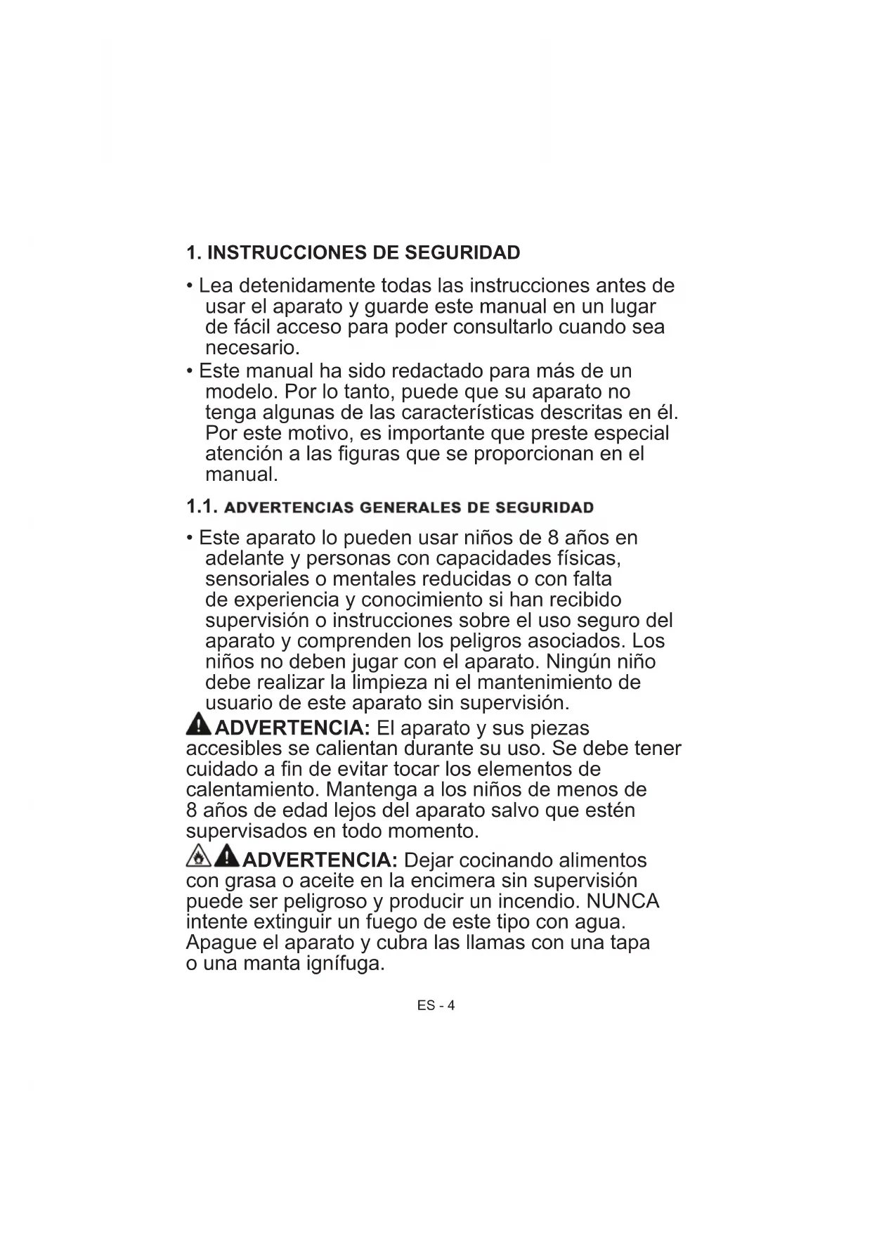 - Este aparato lo pueden usar niños de 8 años en adelante y personas con capacidades físicas, sensoriales o mentales reducidas o con falta de experiencia y conocimiento si han recibido supervisión o instrucciones sobre el uso seguro del aparato y comprenden los peligros asociados. Los niños no deben jugar con el aparato. Ningún niño debe realizar la limpieza ni el mantenimiento de usuario de este aparato sin supervisión. ADVERTENCIA: El aparato y sus piezas accesibles se calientan durante su uso. Se debe tener cuidado a fin de evitar tocar los elementos de calentamiento. Mantenga a los niños de menos de 8 años de edad lejos del aparato salvo que estén supervisados en todo momento. ADVERTENCIA: Dejar cocinando alimentos con grasa o aceite en la encimera sin supervisión puede ser peligroso y producir un incendio. NUNCA intente extinguir un fuego de este tipo con agua. Apague el aparato y cubra las llamas con una tapa o una manta ignífuga.ES - 5 PRECAUCIÓN: El proceso de cocción debe ser supervisado. Un proceso de cocción a corto plazo debe ser supervisado continuamente. ADVERTENCIA: Peligro de incendio: No coloque objetos sobre las superficies donde se cocina. ADVERTENCIA: Si la superficie está rajada, apague el aparato para evitar la posibilidad de que se produzca una descarga eléctrica.