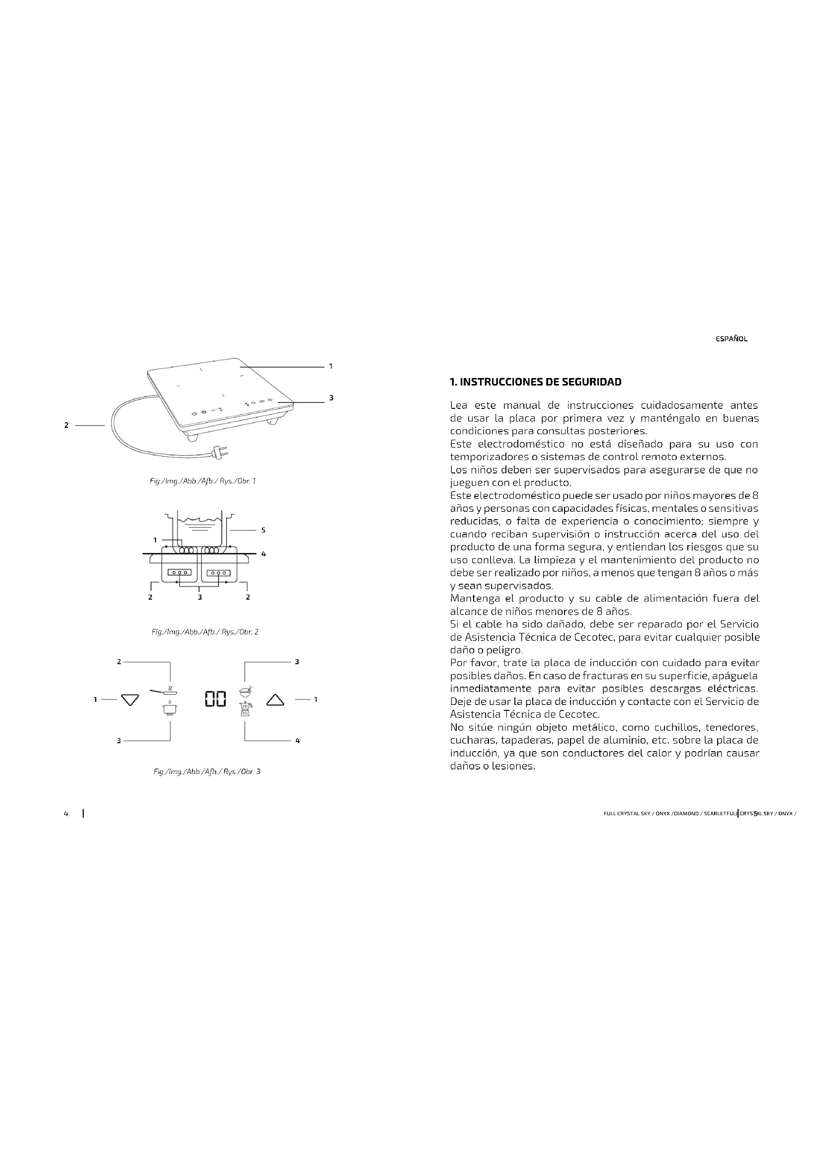 Lea este manual de instrucciones cuidadosamente antes de usar la placa por primera vez y manténgalo en buenas condiciones para consultas posteriores. Este electrodoméstico no está diseñado para su uso con temporizadores o sistemas de control remoto externos. Los niños deben ser supervisados para asegurarse de que no jueguen con el producto. Este electrodoméstico puede ser usado por niños mayores de 8 años y personas con capacidades físicas, mentales o sensitivas reducidas, o falta de experiencia o conocimiento; siempre y cuando reciban supervisión o instrucción acerca del uso del producto de una forma segura, y entiendan los riesgos que su uso conlleva. La limpieza y el mantenimiento del producto no debe ser realizado por niños, a menos que tengan 8 años o más y sean supervisados. Mantenga el producto y su cable de alimentación fuera del alcance de niños menores de 8 años. Si el cable ha sido dañado, debe ser reparado por el Servicio de Asistencia Técnica de Cecotec, para evitar cualquier posible daño o peligro. Por favor, trate la placa de inducción con cuidado para evitar posibles daños. En caso de fracturas en su superficie, apáguela inmediatamente para evitar posibles descargas eléctricas. Deje de usar la placa de inducción y contacte con el Servicio de Asistencia Técnica de Cecotec. No sitúe ningún objeto metálico, como cuchillos, tenedores, cucharas, tapaderas, papel de aluminio, etc. sobre la placa de inducción, ya que son conductores del calor y podrían causar daños o lesiones.FULL CRYSTAL SKY / ONYX /DIAMOND / SCARLETFULL CRYSTAL SKY / ONYX /DIAMOND / SCARLET