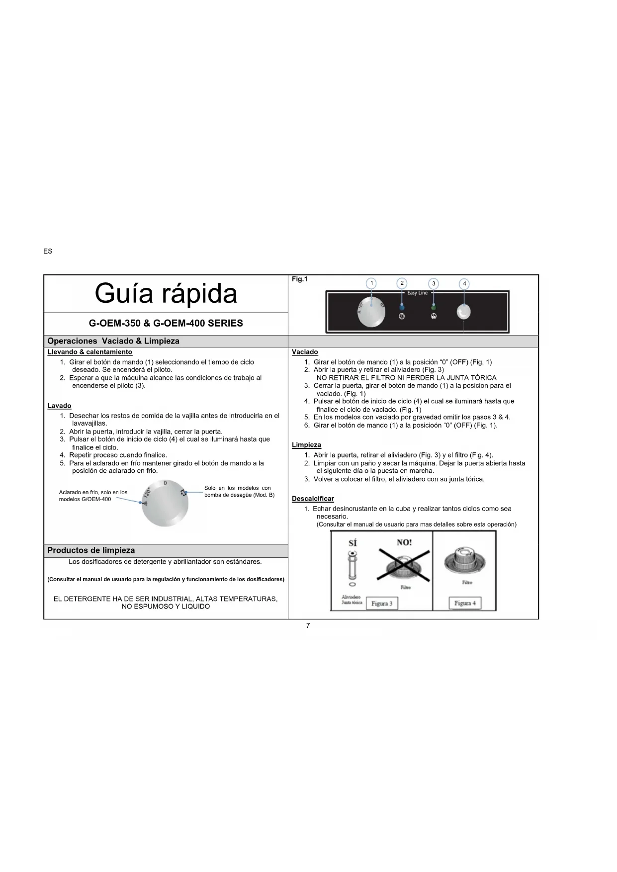 Operaciones Vaciado & Limpieza Llevando & calentamiento 1. Cerrar la puerta, presionar el botón (1). El led dentro del botón (1), se enciende. 2. Esperar a que la máquina alcance las condiciones de funcionamiento. Temperatura de clarado (3) ha de ser mínimo 85°C y el del tanque (4) ha de ser mínimo de 55°C. Lavado 1. Desechar los restos de comida de la vajilla antes de introducirla en el lavavajillas. 2. Abrir la puerta, introducir la vajilla, cerrar la puerta. 3. Seleccionar el ciclo presionando el botón (5), (6) o (7). Los leds incluidos dentro de los botones de ciclo indican que la máquina esta en funcionamiento. Dependiendo del programa seleccionado se encenderá un led u otro. 4. Abrir la puerta y repetir el proceso 5. En los modelos G/T-OEM-400 sin soft, El botón (7) tiene doble función, mientras lo mantengamos pulsado conseguimos el aclarado en frio. Notas: Para acelerar el proceso de calentamiento, realizar un par de ciclos cada uno solamente después de que la temperatura de aclarado alcance los 85°C. Si se inicia el ciclo antes de que la temperatura del aclarado no alcance mínimo 85°C. EL CICLO DE LAVADO PODRÍA SER MÁS LARGO Vaciado 1. Estando la máquina encendida, abrir la puerta. 2. Retirar LOS FILTROS (Fig. 2) y el aliviadero (Fig. 3) NO RETIRAR EL FILTRO NI PERDER LA JUNTA TÓRICA 3. Presionar el botón (5) durante 3 segundos para iniciar el ciclo de vaciado. 4. Esperar hasta que el Led del botón (5) se apague. 5. Para los modelos que desagüan por gravedad, omitir los pasos (3 & 4) 6. Presionar el botón (1) y cerrar la puerta. Regeneración 1. El ciclo de regeneración en los modelos SOFT se debe realizar siempre una vez finalizado el ciclo de vaciado. 2. Si la luz Led (2) está encendida, rellene el bote de sales del interior de la máquina. 3. Abrir la puerta. 4. Pulsar el botón (6) durante 3 segundos. 5. Una vez la luz Led del botón (6) empiece a parpadear, cerrar la puerta. 6. Esperar hasta que el Led del botón (6) se apague. 7. Limpiar el interior de la máquina. Limpieza 1. Abrir la puerta, retirar el aliviadero (Fig. 3) y el filtro (Fig. 4). 2. Limpiar con un paño y secar la máquina. Dejar la puerta abierta hasta el siguiente día o la puesta en marcha. 3. Volver a colocar el filtro, el aliviadero con su junta tórica. Descalcificar 4. Echar desincrustante en la cuba y realizar tantos ciclos como sea necesario. (Consultar el manual de usuario para mas detalles sobre esta operación) Productos de limpieza Los dosificadores de detergente y abrillantador son estándares. (Consultar el manual de usuario para la regulación y funcionamiento de los dosificadores) EL DETERGENTE HA DE SER INDUSTRIAL, ALTAS TEMPERATURAS, NO ESPUMOSO Y LIQUIDO 7ES