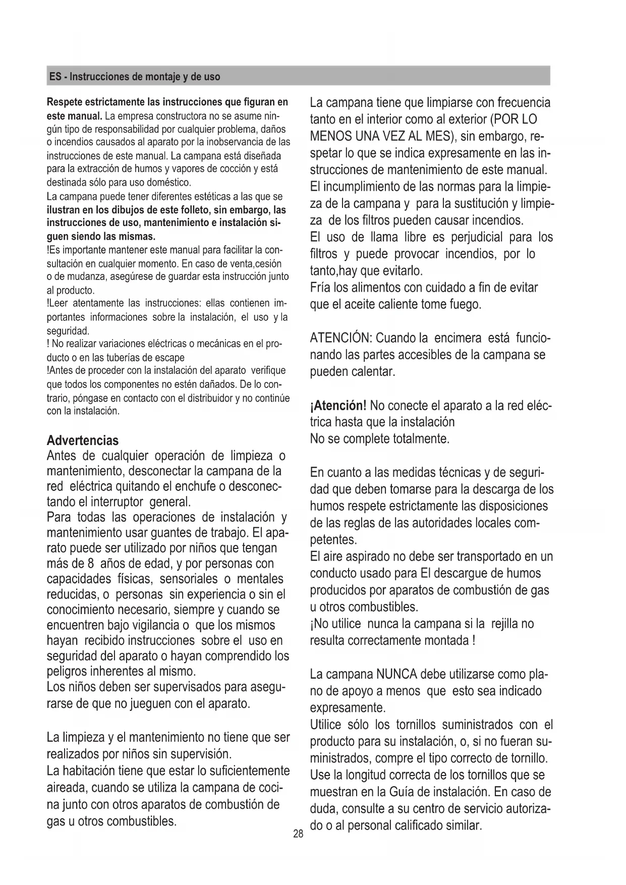 - Plaats de metalen doos met de elektronische componenten op een goed bereikbare plaats voor eventueel onderhoud en maak de elektri- sche verbindingen met de afzuigkap (Afb.11) Werking Voor de normale werking van het product moet de uitklapwagen als volgt worden opengeklapt. Duw het glas naar onder zoals op de Afb. 12. Het zal loskomen en zich openen. Zodra de uitklapwagen open is, kunt u de af- zuigmotor aan zetten met de bedieningen zoals hieronder is uitgelegd. Sluit het paneel op dezelfde manier. Druk op het glas totdat de wagen volledig is ingeklapt en gesloten. T1. T2. T3. Toets ON / OFF timer: indrukken om het automatisch uitschakelen te programmeren: Snelheid 1: 20 minuten Snelheid 2: 15 minuten Snelheid 3: 10 minuten Hoge Snelheid: 5 minuten Toets om de afzuigsnelheid (vermogen) te vermin- deren OFF 1: druk de toets enkele keren in om de snelheid te minderen totdat de afzuigkap uit valt. OFF 2: lang genoeg indrukken bij elke afzuigsnel- heid. Toets ON/hogere snelheid (afzuigvermogen) (1-2-3- Hoog). De hoge snelheid duurt ongeveer 5 minuten, waarna de kap automatisch overschakelt op de snelheid 2.27 Filterverzadigingswaarschuwing De afzuigkap waarschuwt als de lters onderhoud nodig hebben: Vetlter (ongeveer om de 40 draaiuren): alle lichtblauwe LEDS gaan branden Geurlter met actief koolstof (ongeveer om de 160 dra- aiuren): alle lichtblauwe LEDS gaan branden, het lampje L2 en L3 knipperen Reset lterverzadiging Als het onderhoud aan de lters gedaan is, drukt u de toet- sen T1 en T3 lang genoeg in. De lichtblauwe LEDS L1, L2 en L3 knipperen even en gaan dan uit. De waarschuwing voor de verzadiging van de actief- koolstoflter inschakelen Deze waarschuwingsfunctie is meestal uitgeschakeld. Schakel de waarschuwing als volgt in: Terwijl de kap uit staat, houdt u lang genoeg tegelijkertijd de toetsen T1 en T2 ingedrukt: eerst zal de LED L1 gaan branden en dan ook L2 en L3. Als u de LED-toetsen L2 en L3 loslaat, knipperen ze even om de inschakeling te bevestigen. Uitschakeling LED koolstoflterverzadiging: herhaal de hierboven beschreven procedure. Eerst gaan alle LEDS L1, L2 en L3 samen aan, waarna, als u de LED-toetsen L2 en L3 loslaat, ze uit gaan om de uitschakeling te bevestigen. ONDERHOUD Vetlter Houdt de vetdeeltjes tegen die door het koken vrijkomen. Deze lter moet een keer per maand worden gereinigd (of als het systeem voor de verzadiging van de lters waar- schuwt - indien voorzien voor het model), met zachte reini- gingsproducten, met de hand of in de vaatwasmachine met een korte cyclus en een lage watertemperatuur. De metalen vetlter kan in de vaatwasmachine verkleuren, maar dit wijzigt niets aan de lterkenmerken. Filter met actief koolstof (alleen voor de lteruitvoering): houdt onaangename geuren tegen. Het duurt vrij lang voordat de koolstoflter verzadigd raakt, afhankelijk van de kookapparatuur en de regelmaat waar- mee de vetlters worden gereinigd. In elk geval moet de vulling om de vier maanden worden vervangen. Als de vetlters zijn verwijderd, kunt u de koolstoflters pla- atsen (Afb. 8).28 ES - Instrucciones de montaje y de uso Respete estrictamente las instrucciones que guran en este manual. La empresa constructora no se asume nin- gún tipo de responsabilidad por cualquier problema, daños o incendios causados al aparato por la inobservancia de las instrucciones de este manual. La campana está diseñada para la extracción de humos y vapores de cocción y está destinada sólo para uso doméstico. La campana puede tener diferentes estéticas a las que se ilustran en los dibujos de este folleto, sin embargo, las instrucciones de uso, mantenimiento e instalación si- guen siendo las mismas. !Es importante mantener este manual para facilitar la con- sultación en cualquier momento. En caso de venta,cesión o de mudanza, asegúrese de guardar esta instrucción junto al producto. !Leer atentamente las instrucciones: ellas contienen im- portantes informaciones sobre la instalación, el uso y la seguridad. ! No realizar variaciones eléctricas o mecánicas en el pro- ducto o en las tuberías de escape !Antes de proceder con la instalación del aparato verique que todos los componentes no estén dañados. De lo con- trario, póngase en contacto con el distribuidor y no continúe con la instalación. Advertencias Antes de cualquier operación de limpieza o mantenimiento, desconectar la campana de la red eléctrica quitando el enchufe o desconec- tando el interruptor general. Para todas las operaciones de instalación y mantenimiento usar guantes de trabajo. El apa- rato puede ser utilizado por niños que tengan más de 8 años de edad, y por personas con capacidades físicas, sensoriales o mentales reducidas, o personas sin experiencia o sin el conocimiento necesario, siempre y cuando se encuentren bajo vigilancia o que los mismos hayan recibido instrucciones sobre el uso en seguridad del aparato o hayan comprendido los peligros inherentes al mismo. Los niños deben ser supervisados para asegu- rarse de que no jueguen con el aparato. La limpieza y el mantenimiento no tiene que ser realizados por niños sin supervisión. La habitación tiene que estar lo sucientemente aireada, cuando se utiliza la campana de coci- na junto con otros aparatos de combustión de gas u otros combustibles. La campana tiene que limpiarse con frecuencia tanto en el interior como al exterior (POR LO MENOS UNA VEZ AL MES), sin embargo, re- spetar lo que se indica expresamente en las in- strucciones de mantenimiento de este manual. El incumplimiento de las normas para la limpie- za de la campana y para la sustitución y limpie- za de los ltros pueden causar incendios. El uso de llama libre es perjudicial para los ltros y puede provocar incendios, por lo tanto,hay que evitarlo. Fría los alimentos con cuidado a n de evitar que el aceite caliente tome fuego. ATENCIÓN: Cuando la encimera está funcio- nando las partes accesibles de la campana se pueden calentar. ¡Atención! No conecte el aparato a la red e